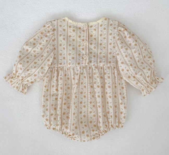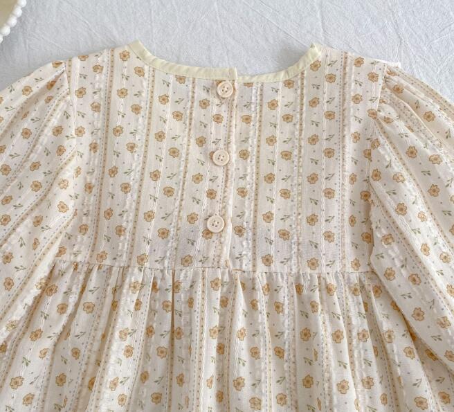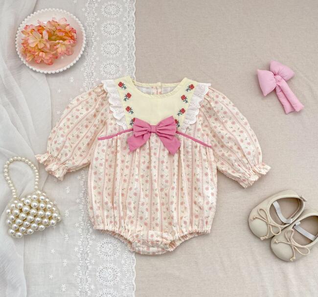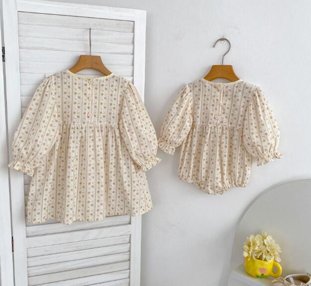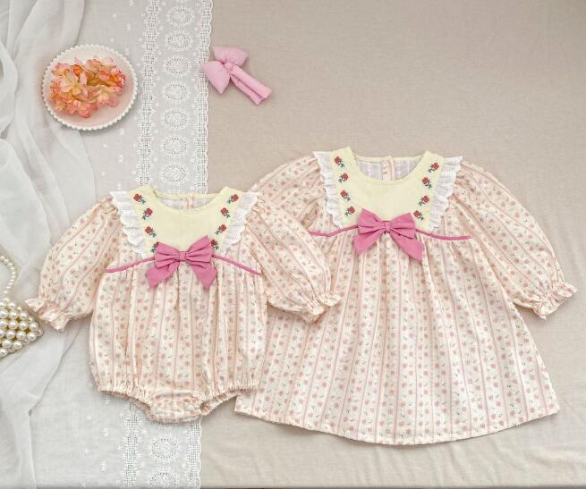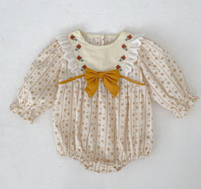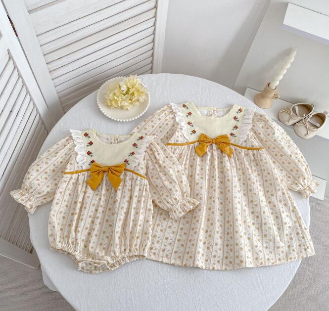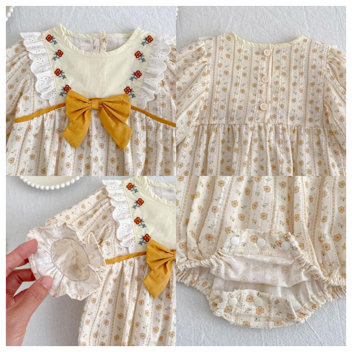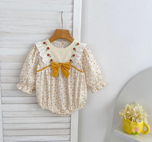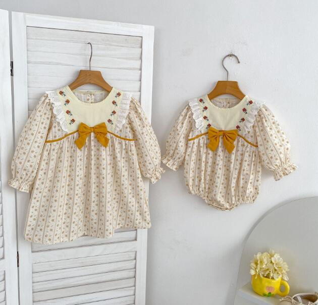 可愛い花柄刺繍が施されたキッズ向けロングワンピースとロンパースのセットです。 上品なクリーム色に黄色のリボンがアクセントになった優雅なデザイン。 長袖で季節を問わず着用でき、お出かけや特別な日にぴったりです。