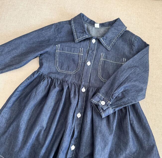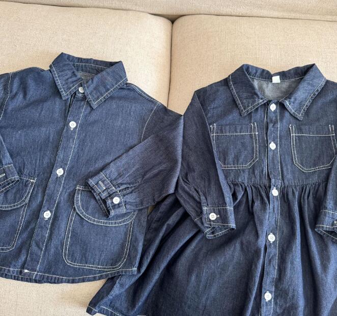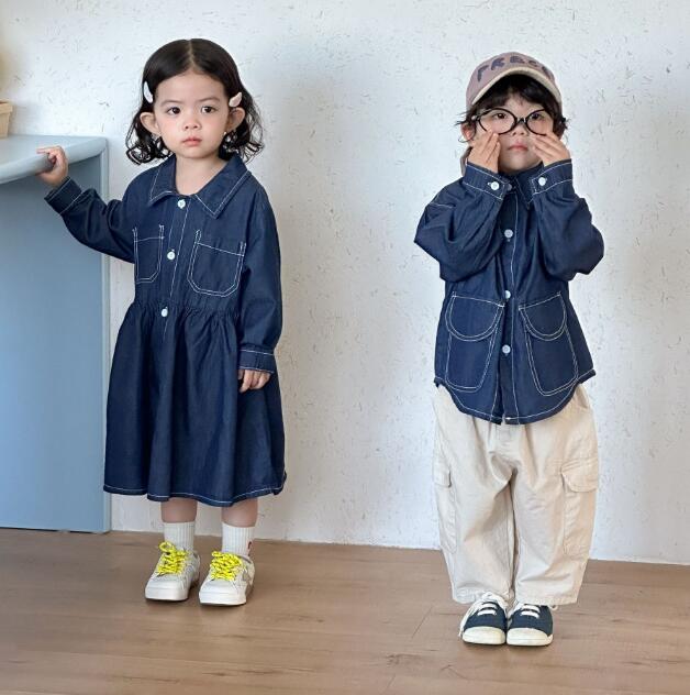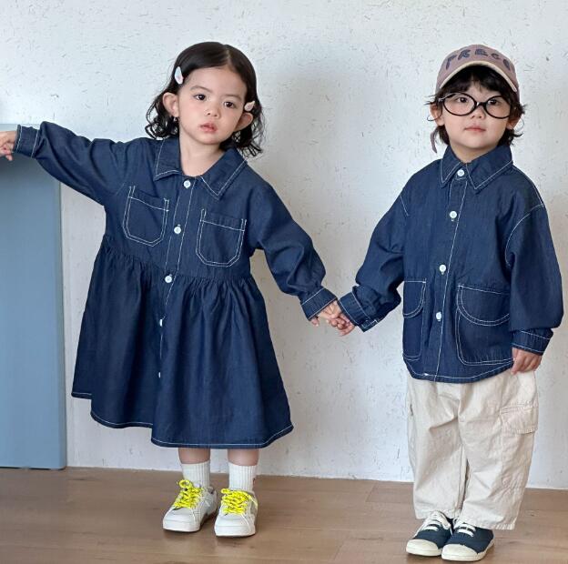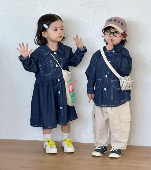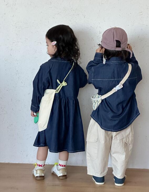 姉妹兄弟でお揃いコーデが楽しめるキッズ用デニム風ロングワンピースです。