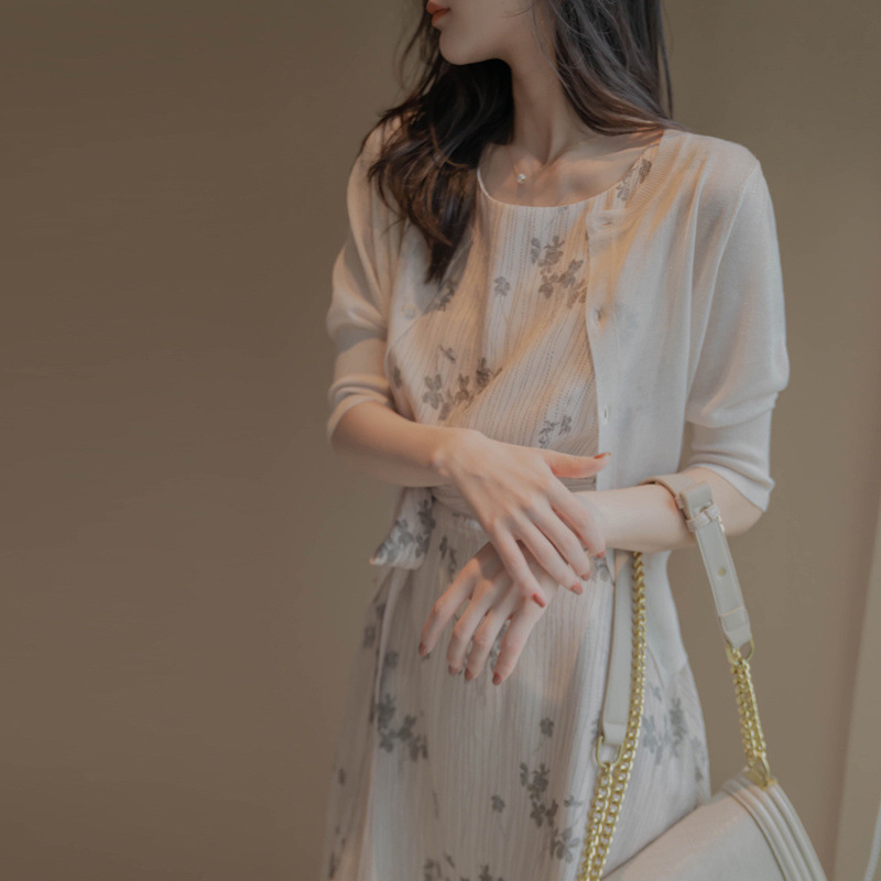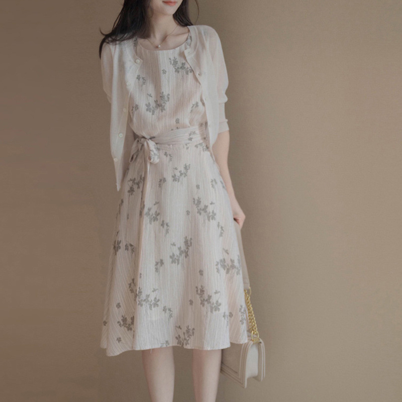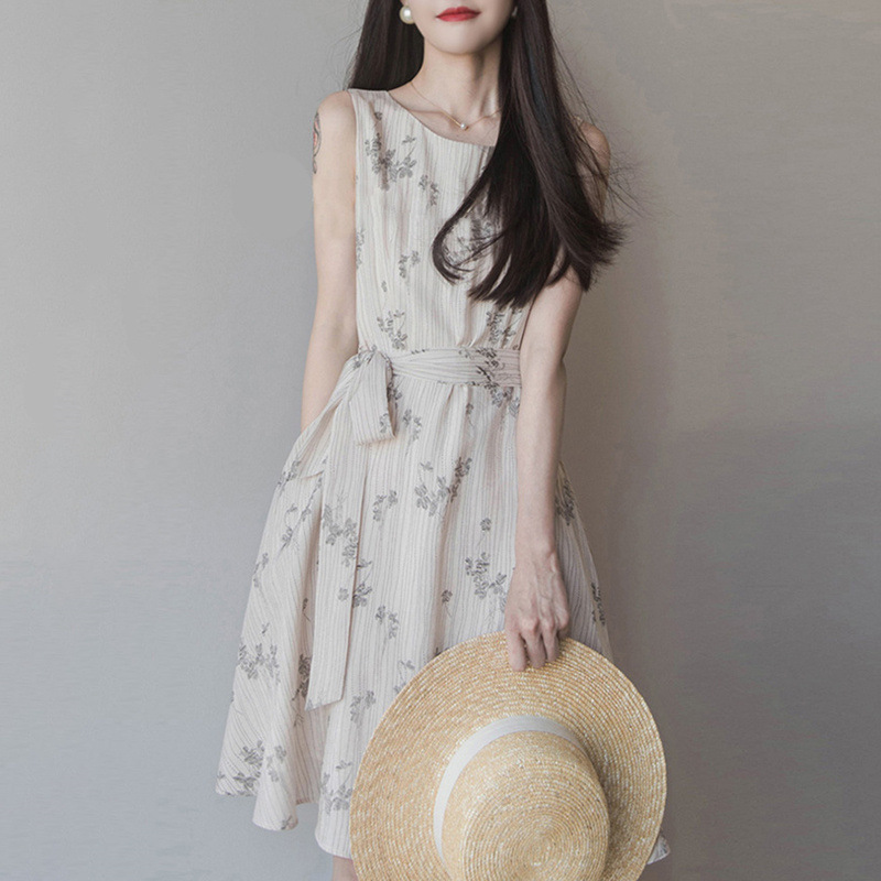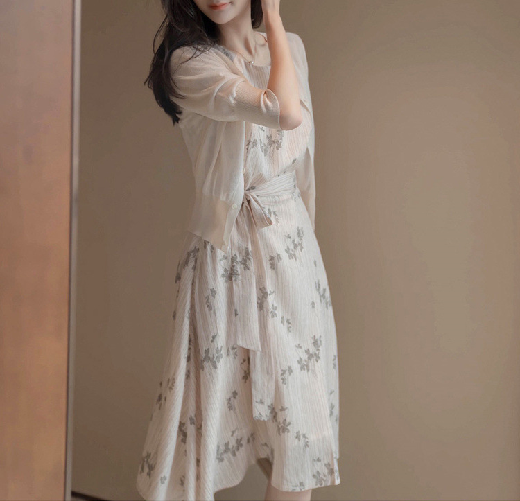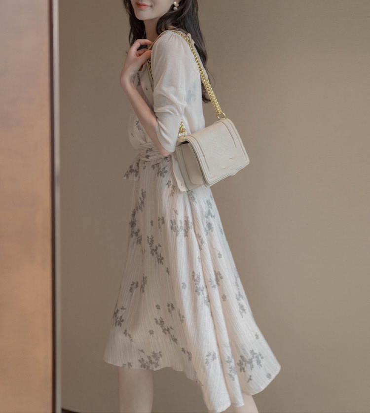 繊細な花柄が美しい膝丈ワンピースは、結婚式やパーティーに最適。
