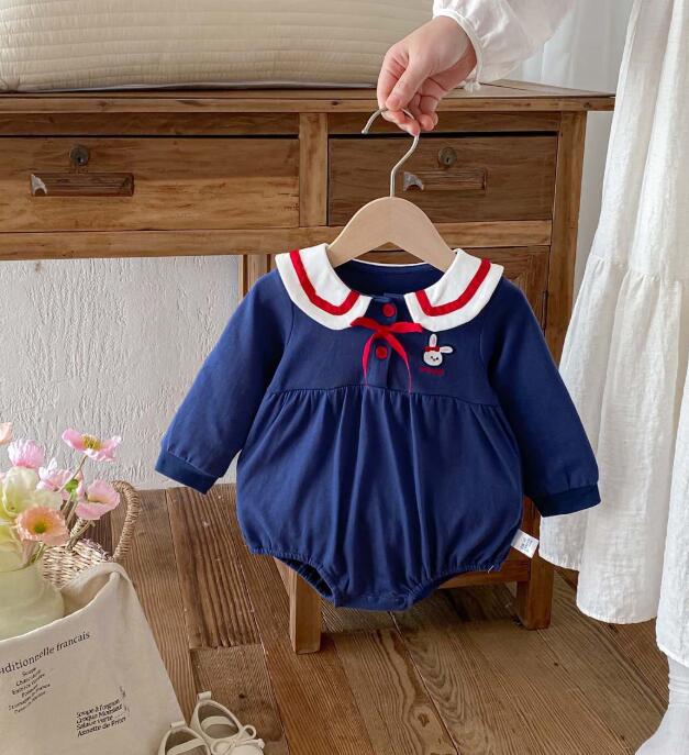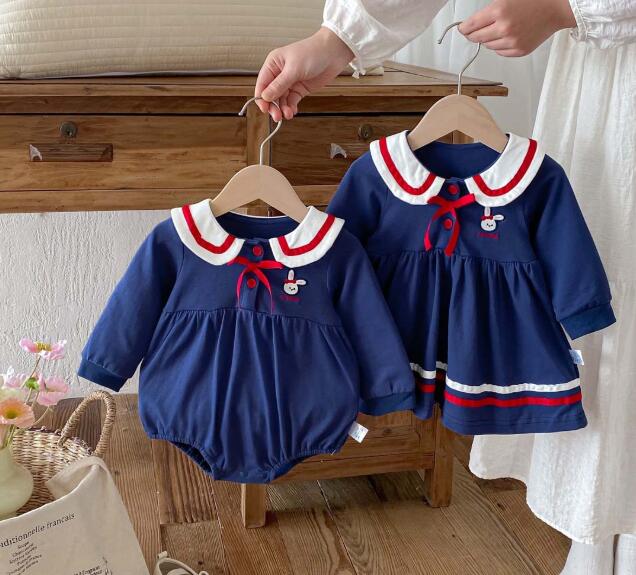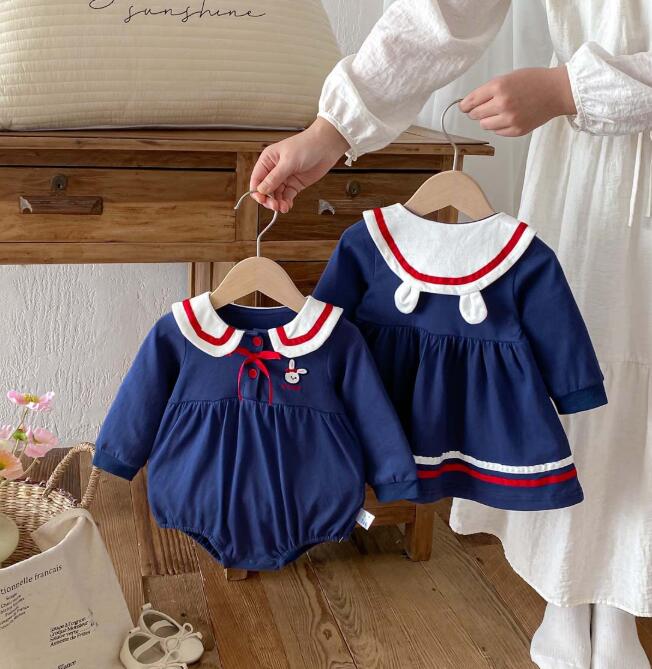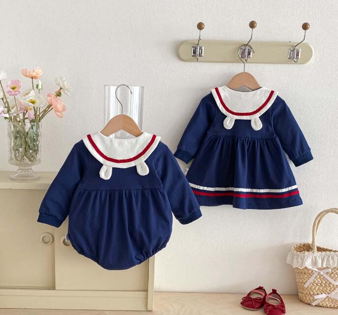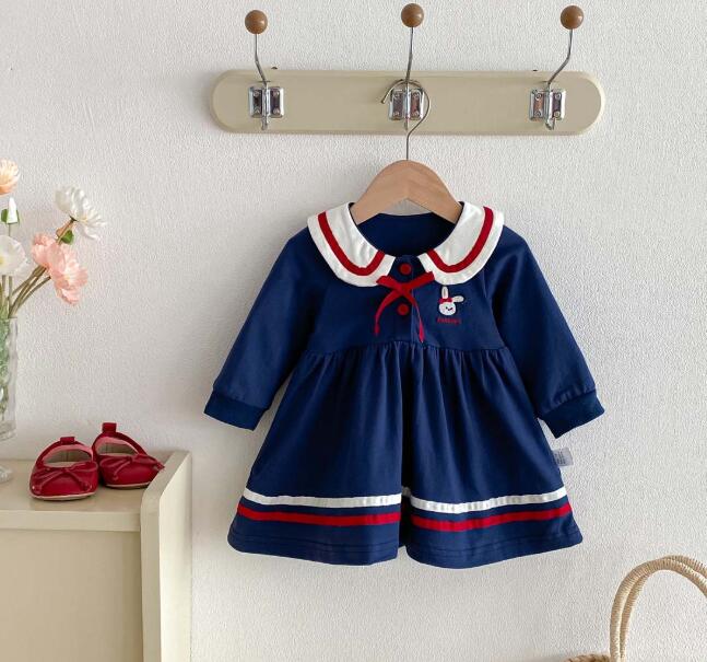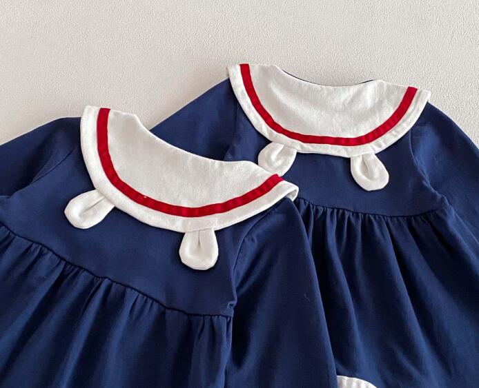 上品なネイビーカラーのキッズ用セーラー風ロングワンピースが登場しました。