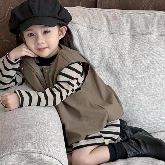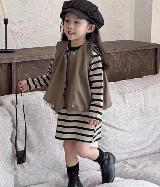 カーキ色のベストと白黒ボーダー柄のロングワンピースの組み合わせで、