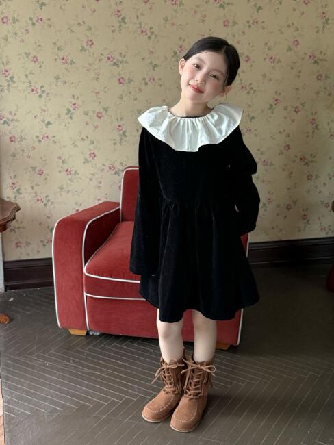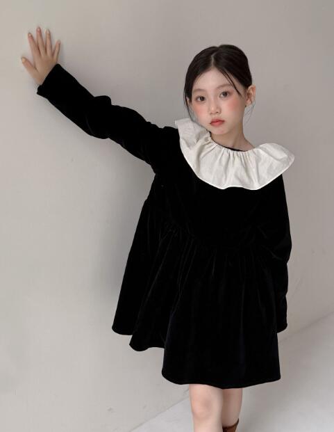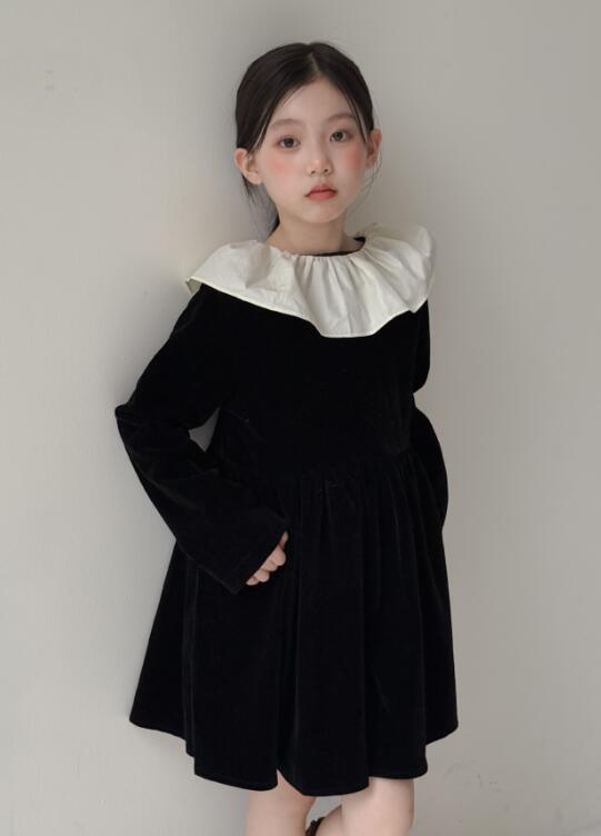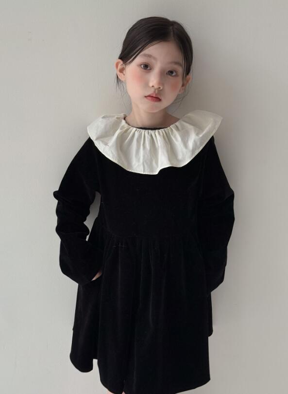 上品な白い襟がアクセントの黒いロングワンピースです。 キッズの特別な日にぴったりな、クラシカルで可愛らしいデザイン。 長袖で季節を問わず着用でき、100センチから160センチまで豊富なサイズ展開で成長に合わせてお選びいただけます。