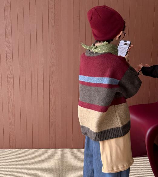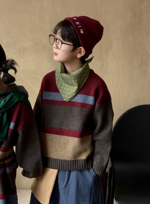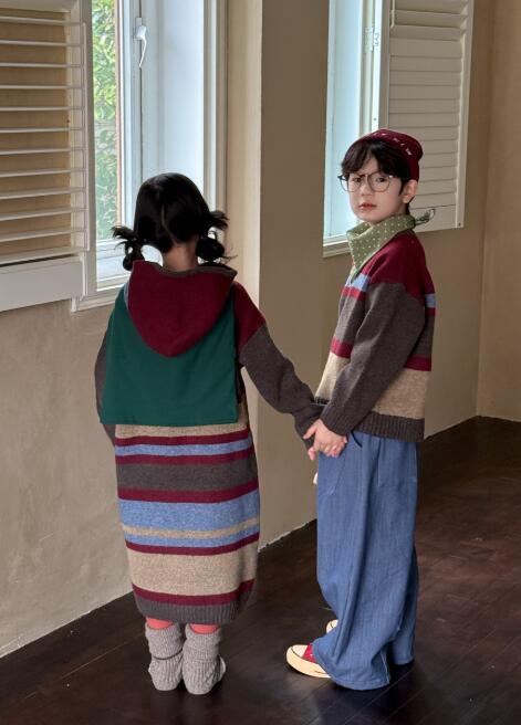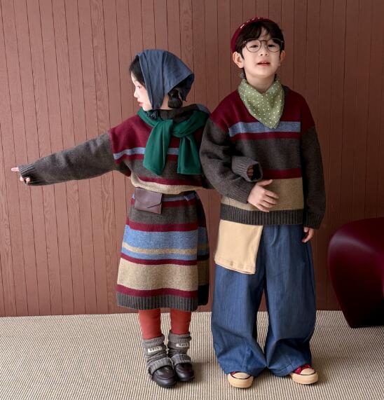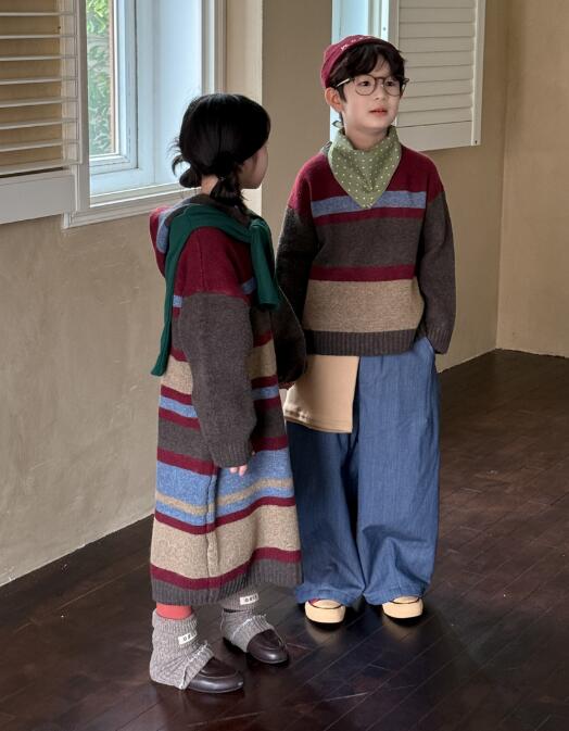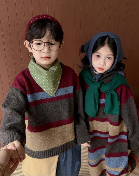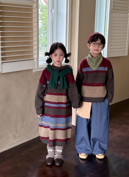 暖かくておしゃれなキッズ用ボーダー柄ニットワンピースです。 秋冬にぴったりの厚手セーター素材で、ロングワンピースとして一枚で様になります。 90センチから150センチまで豊富なサイズ展開で、男女問わずお使いいただけるデザインです。