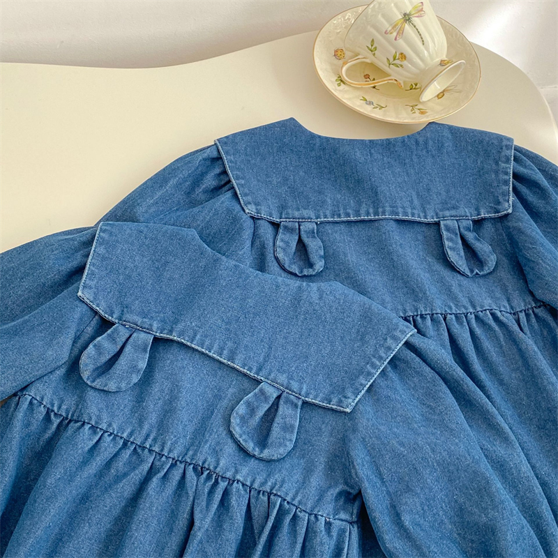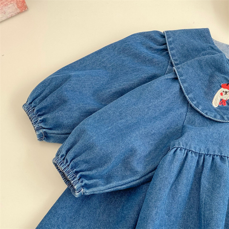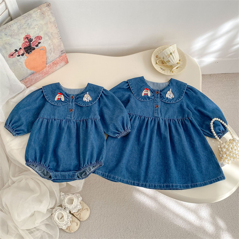 可愛い刺繍が施された襟付きデニムのベビー服セット。