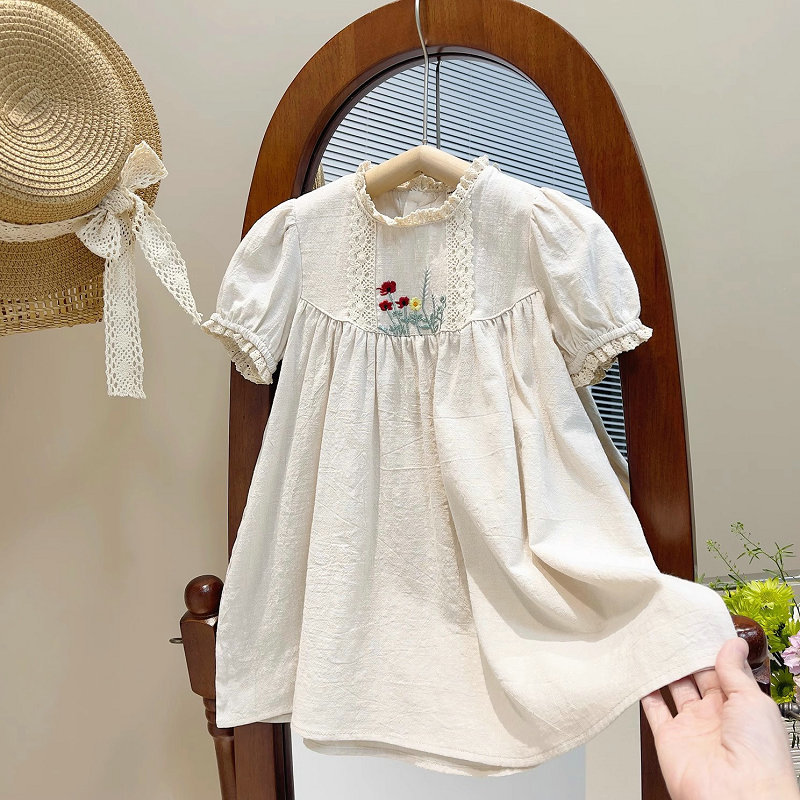 上品な花の刺繍とレース装飾が可愛いキッズ半袖ワンピースです。