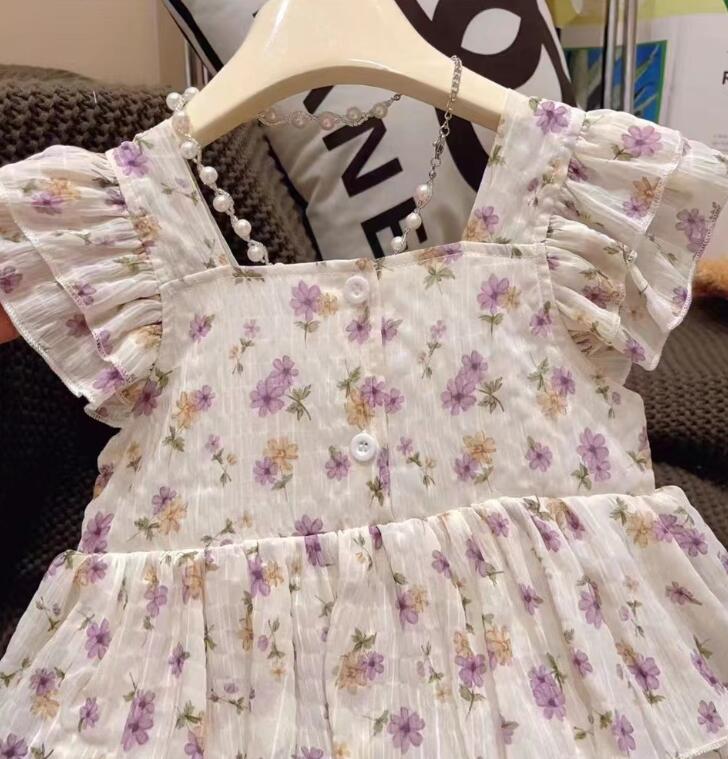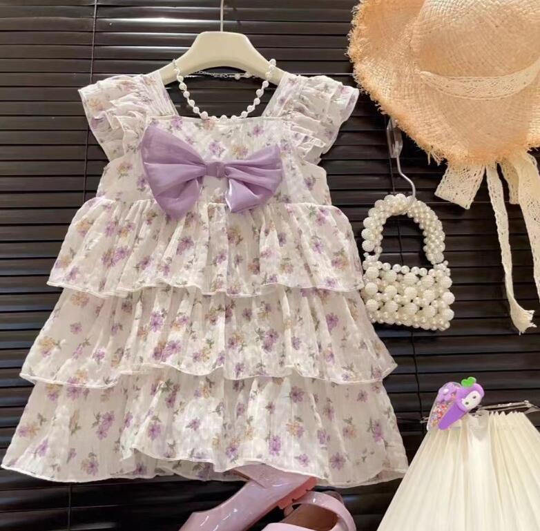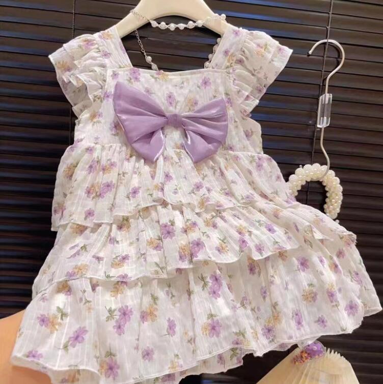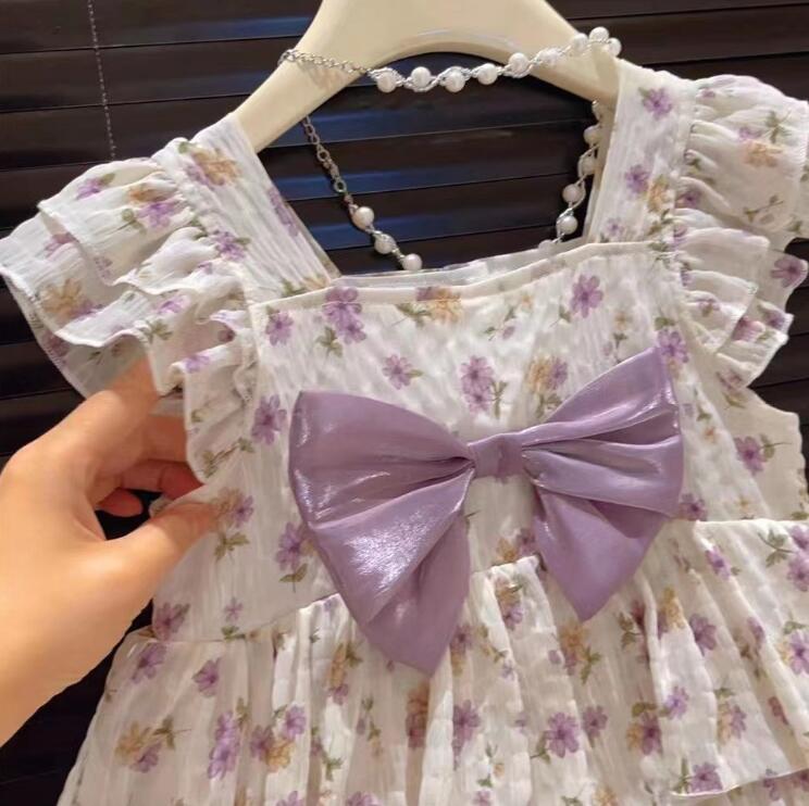 可愛い花柄とパープルのリボンが印象的なキッズ向けロングワンピースです。
