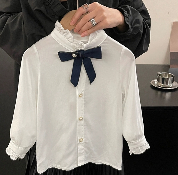 白いブラウスとの重ね着で正統派な着こなしが楽しめます。