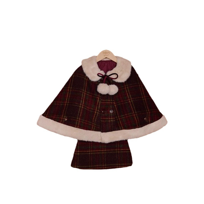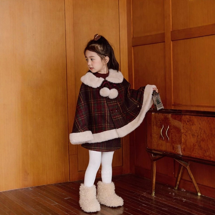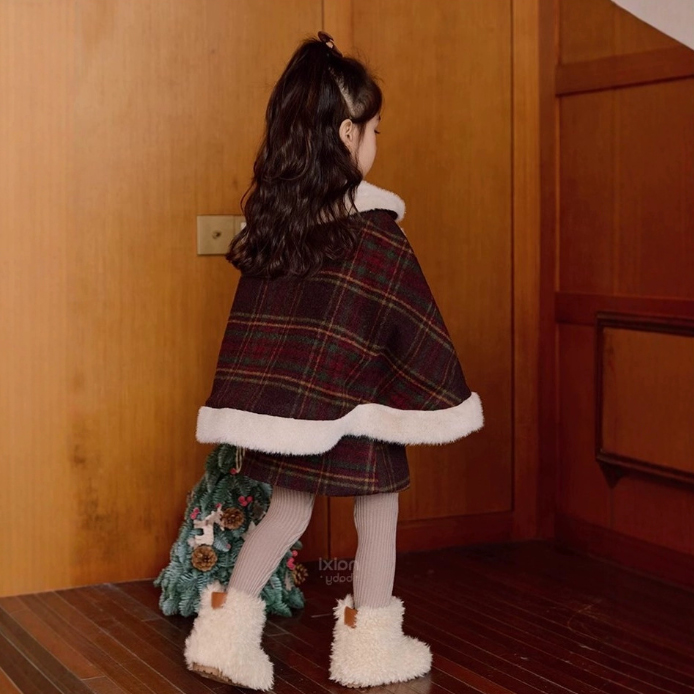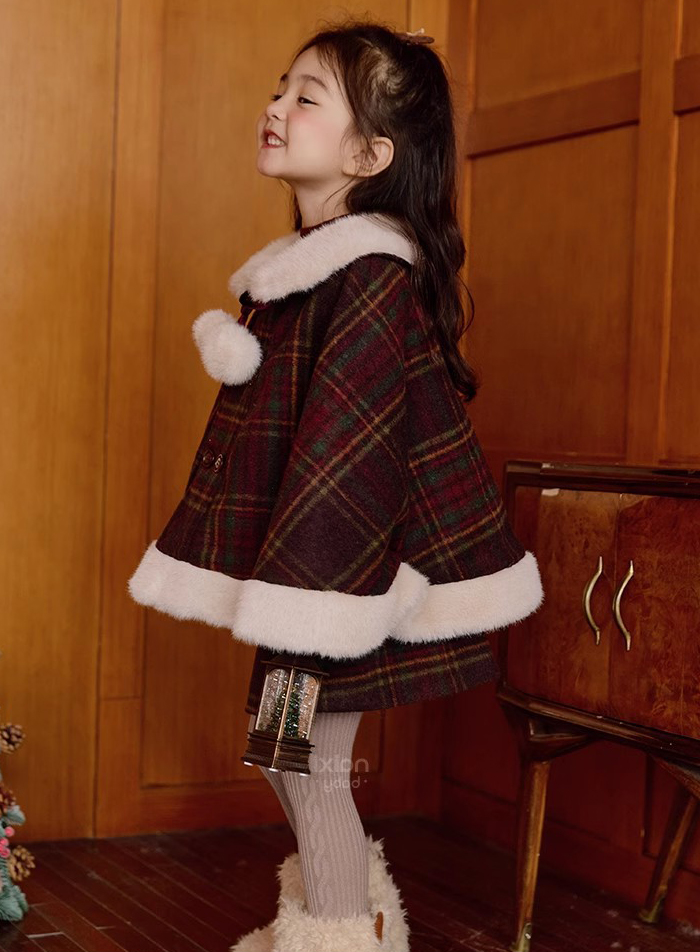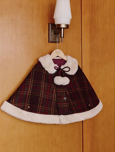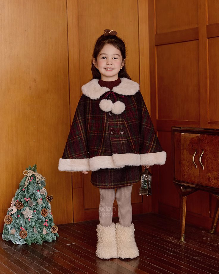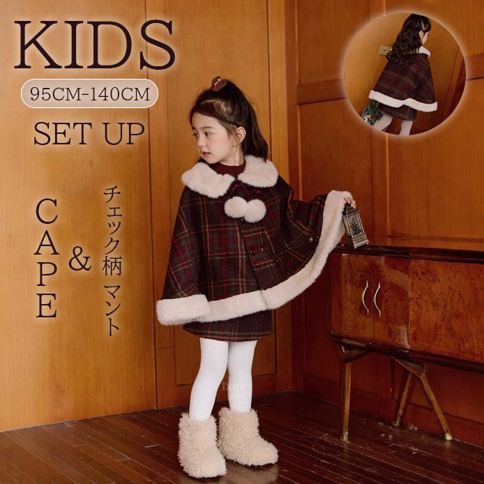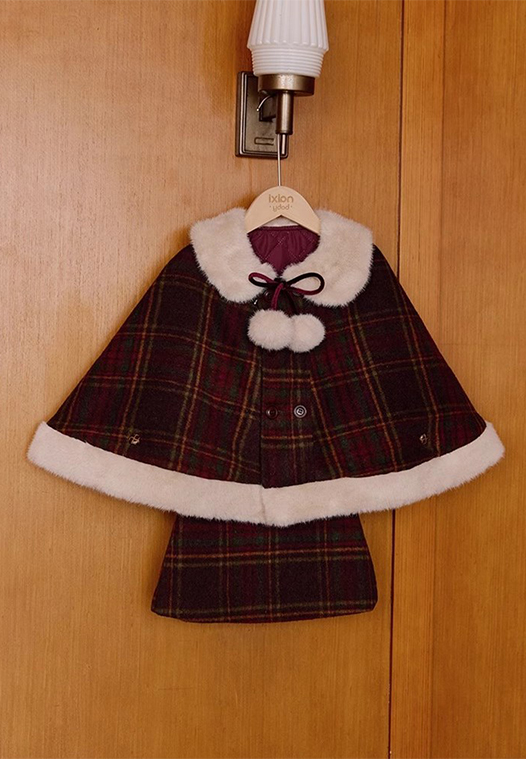チェック柄のロングワンピースと暖かいファー付きマントがセットになっています。