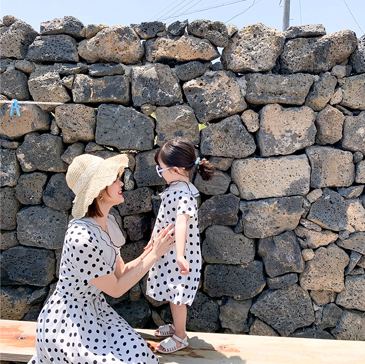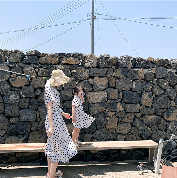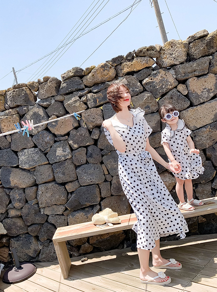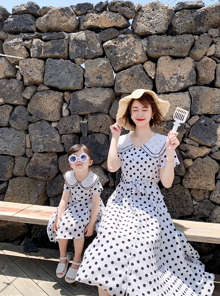 親子でお揃いコーデが楽しめるキッズ用ドット柄ロングワンピース。