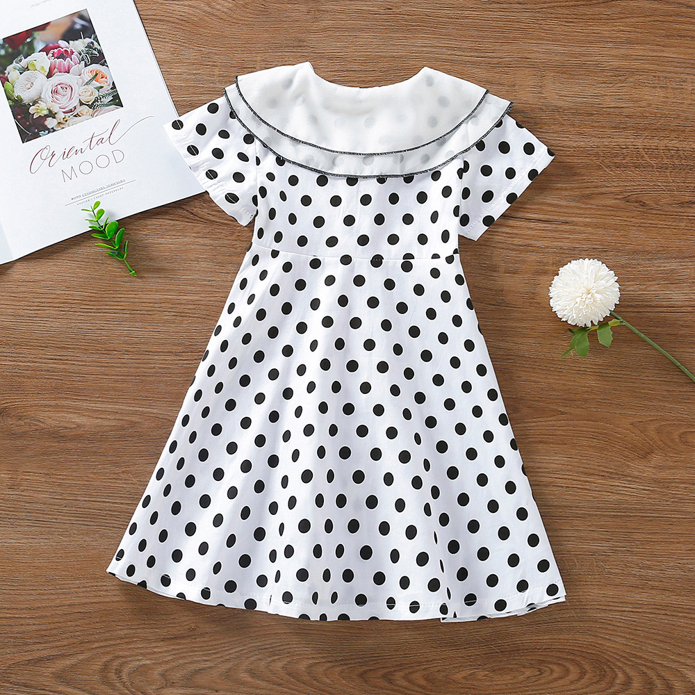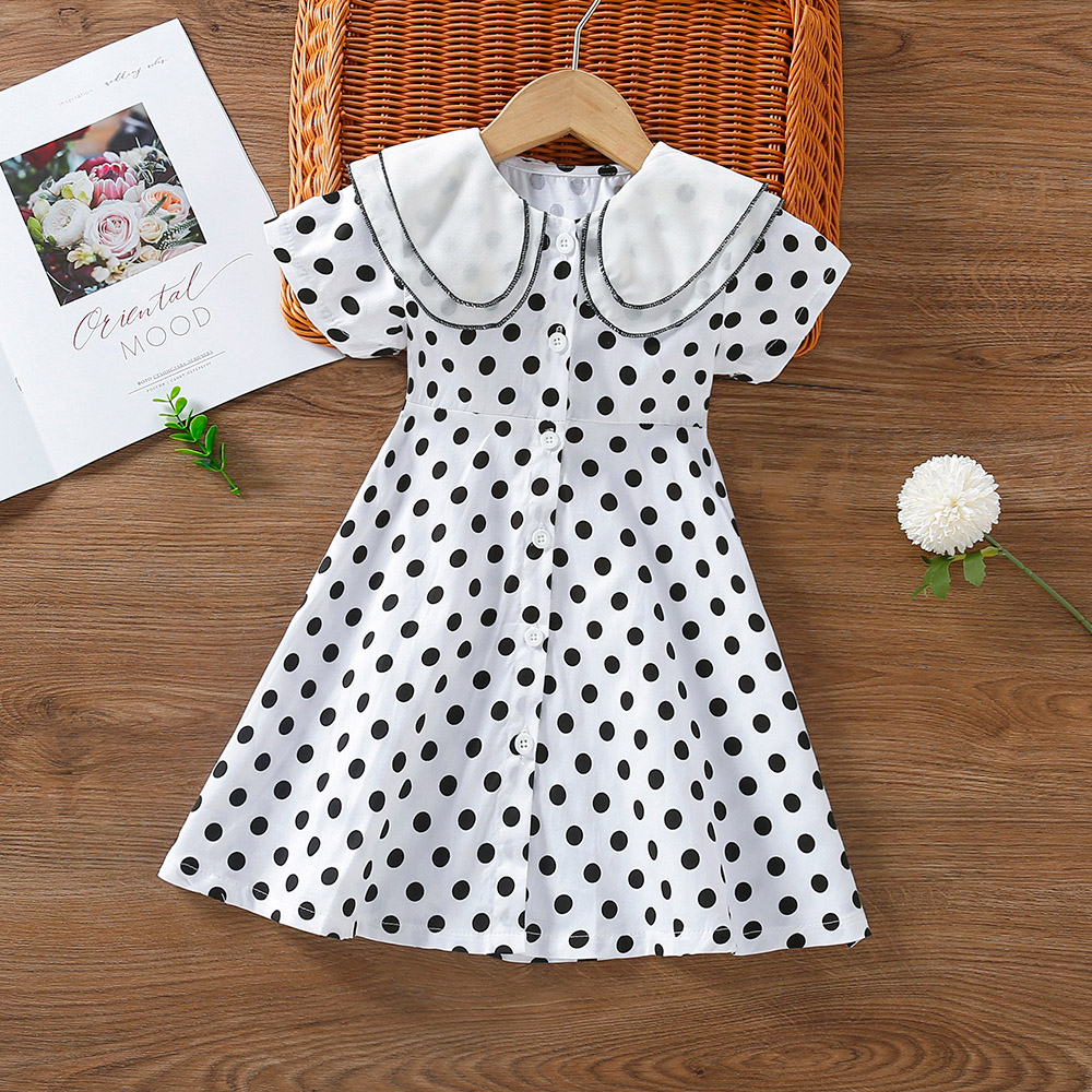 白地に黒ドットの上品なデザインで、襟付きの可愛らしいシルエットが特徴です。
