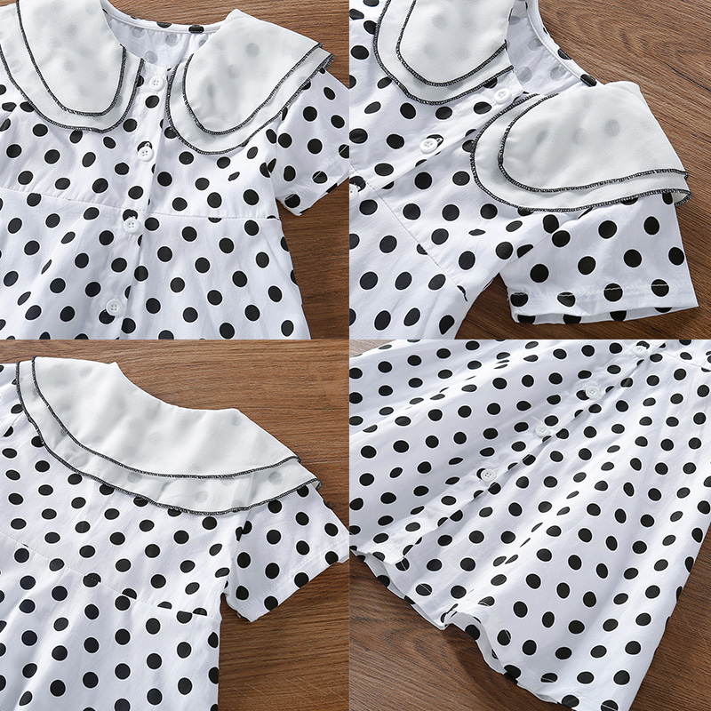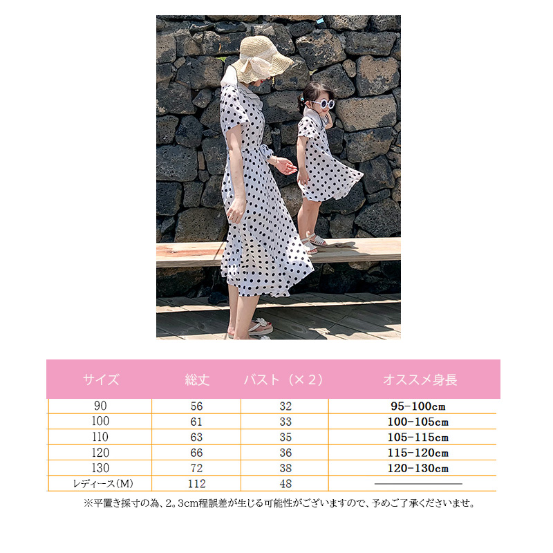 ※キッズ用とレディース用がございます。 ■コメント ・可愛らしいドット柄。 ・清潔感のあるホワイトカラーで夏にぴったりです。 ・大きな襟がポイントで一枚で華やか ・品質が良く、柔らかな肌触りで快適な着心地。 ・ぜひ親子コーデをお楽しみください♪ ■サイズ(単位:約cm) 画像に記載 ■カラー 綿60%ポリエステル40% ■伸縮性 なし ■裏地 なし ■生地の厚さ 普通 ■透け感 なし