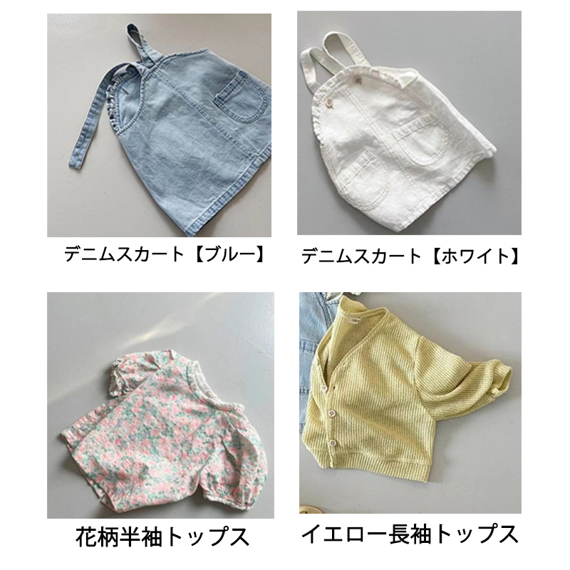 ■コメント ・着回し抜群のデニムワンピース。 ・花柄の半袖トップスは女の子らしさをアップさせてくれます。 ・鮮やかな長袖のイエロートップス。 ・柔らかな素材で優しく快適な着心地。 ■サイズ(単位:約cm) トップス 73cm:着丈33、バスト29、肩幅26、袖丈13 80cm:着丈35、バスト30、肩幅27、袖丈13.5 90cm:着丈37、バスト31、肩幅28、袖丈14 100cm:着丈39、バスト32、肩幅29、袖丈14.5 110cm:着丈41、バスト33、肩幅30、袖丈15 120cm:着丈43、バスト34、肩幅31、袖丈15.5 スカート 73cm:総丈42.5、バスト30 80cm:総丈45、バスト31 90cm:総丈47.5、バスト32 100cm:総丈50、バスト33 110cm:総丈52.5、バスト34 120cm:総丈55、バスト35 ■カラー 綿80%ポリエステル20% ■伸縮性 なし ■裏地 なし ■生地の厚さ 普通 ■透け感 なし