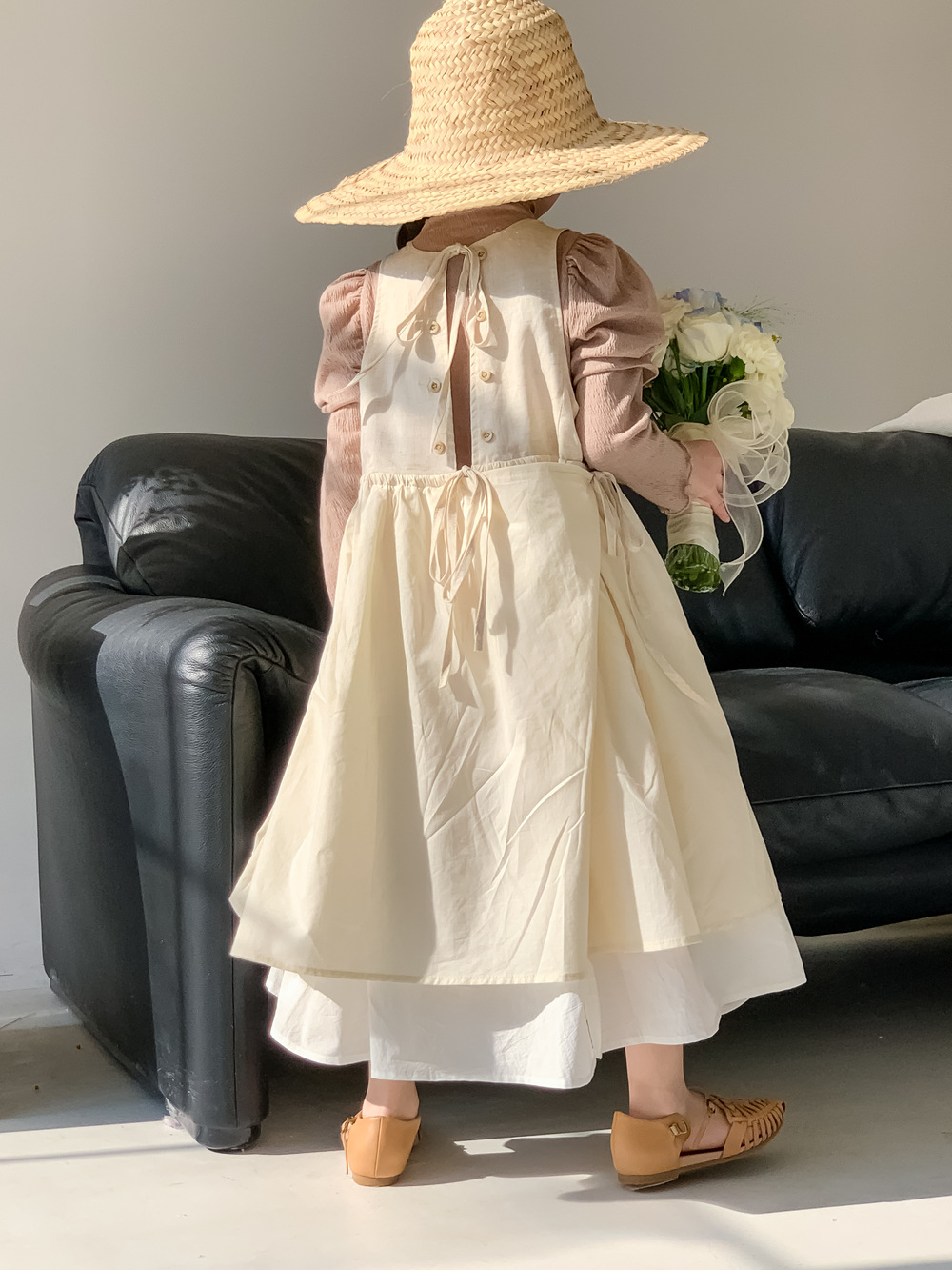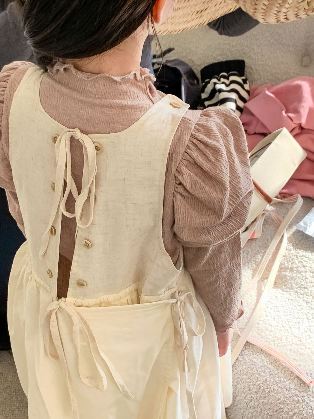 ふんわりパフスリーブが特徴的な長袖トップスと、