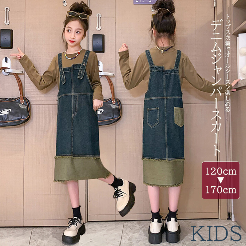 ■コメント ・レトロ感のある切替デザインでオシャレな雰囲気。 ・大人っぽい広がらないタイトなシルエット。 ・膝が隠れる丁度良い丈感。 ・ショルダー紐は長さが調節できます。 ・バックの違うカラーのポケットがカワイイ。 ・トップス次第でオールシーズン楽しめます。 ・120cmー170cmまで幅広いサイズ展開。 ■サイズ(単位:約cm) 120 適応年齢5-6歳 適応身長105-115cm 130 適応年齢7-8歳 適応身長115-125cm 140 適応年齢9-10歳 適応身長125-135cm 150 適応年齢10-11歳 適応身長135-145cm 160 適応年齢11-12歳 適応身長 145-155cm 170 適応年齢13歳以上 適応身長155-165cm ■カラー 綿50%アクリル50% ■伸縮性 なし ■裏地 なし ■生地の厚さ 普通 ■透け感 なし