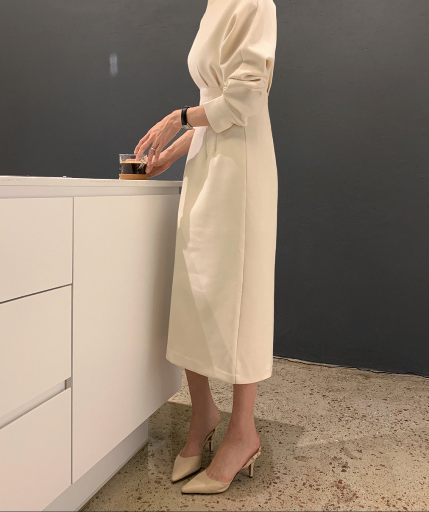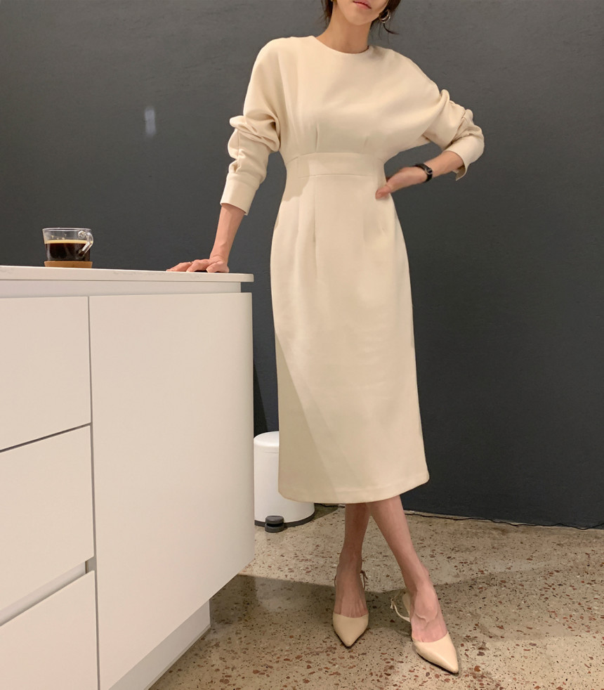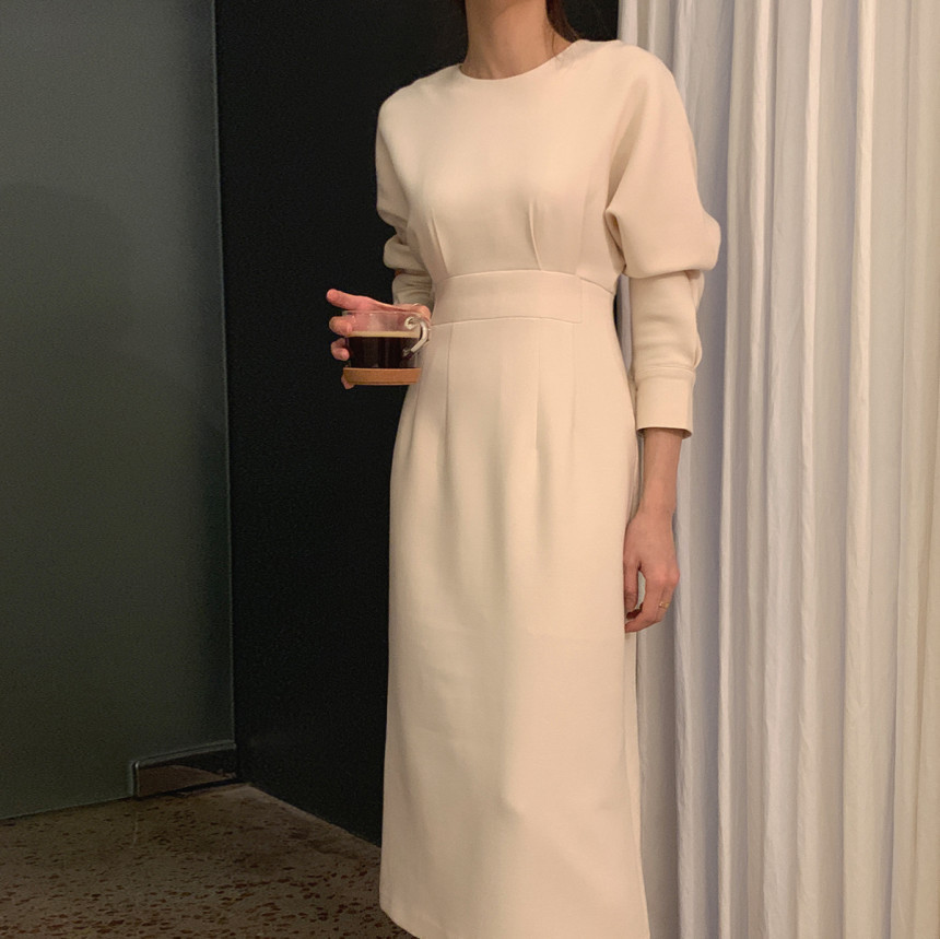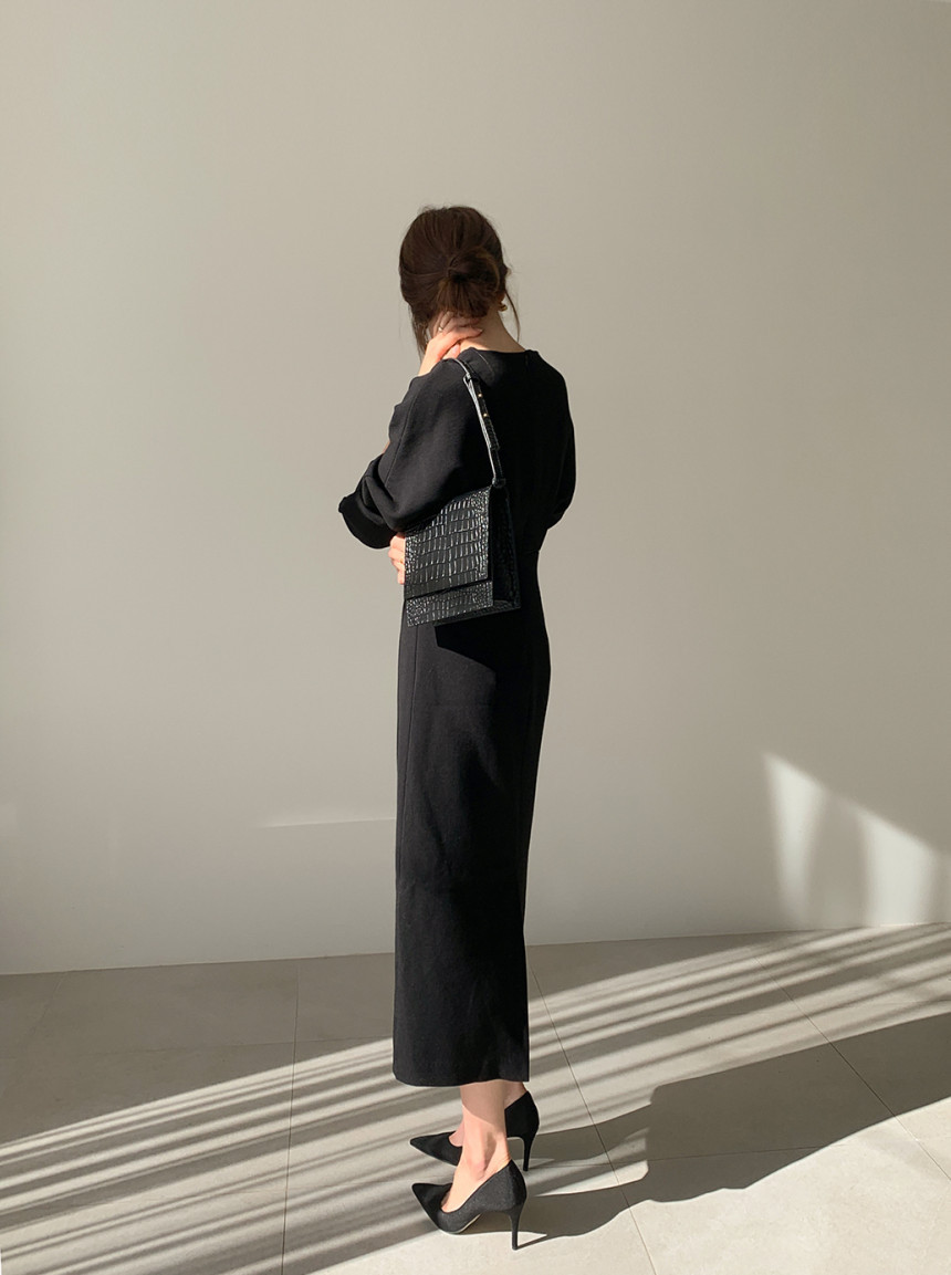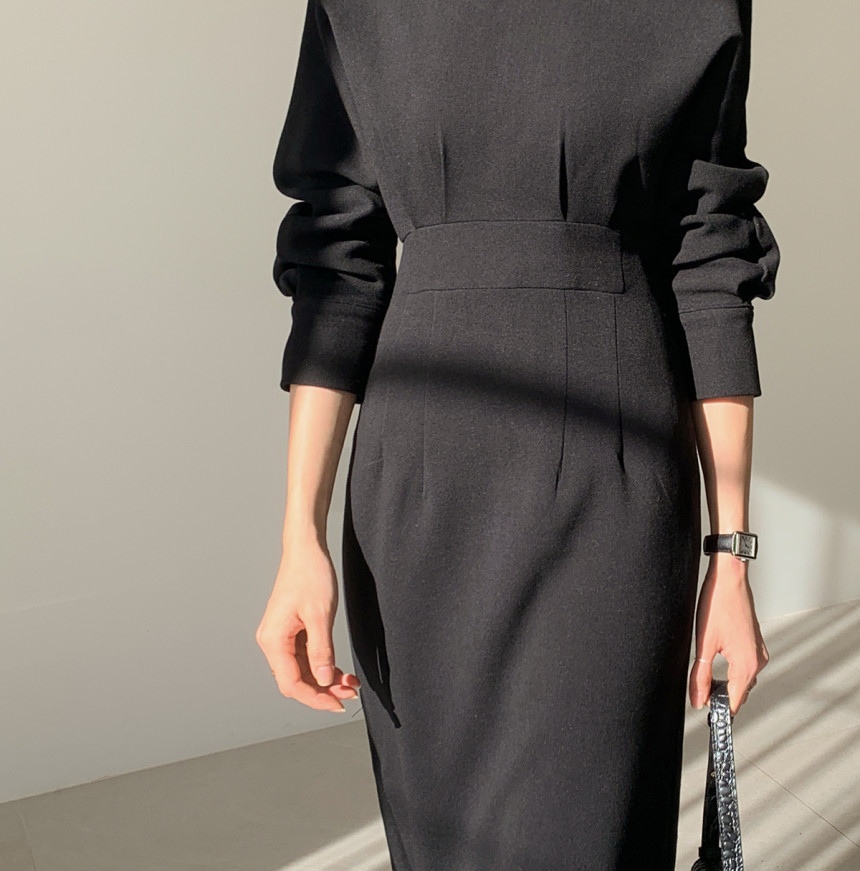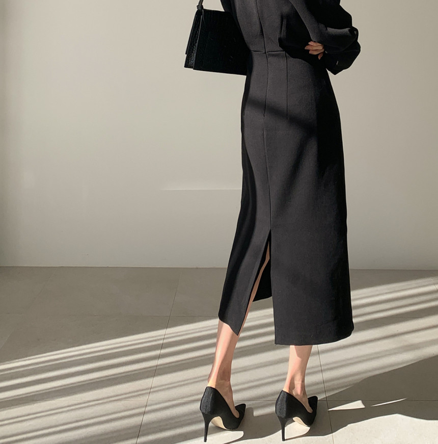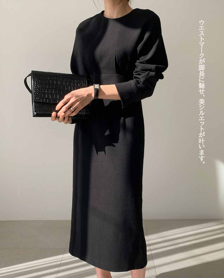 美しいシルエットが魅力的なタイトロングワンピース。