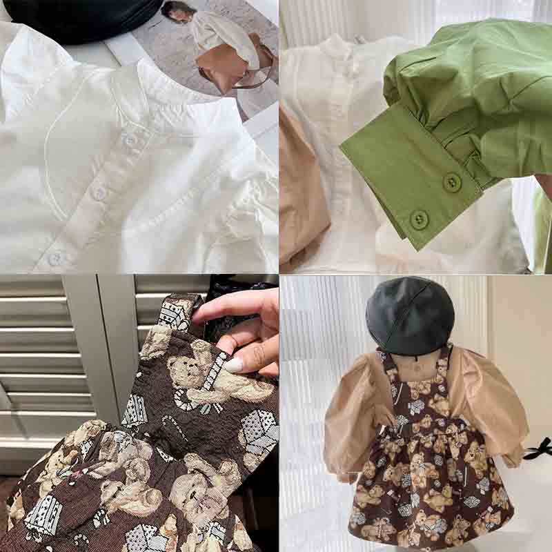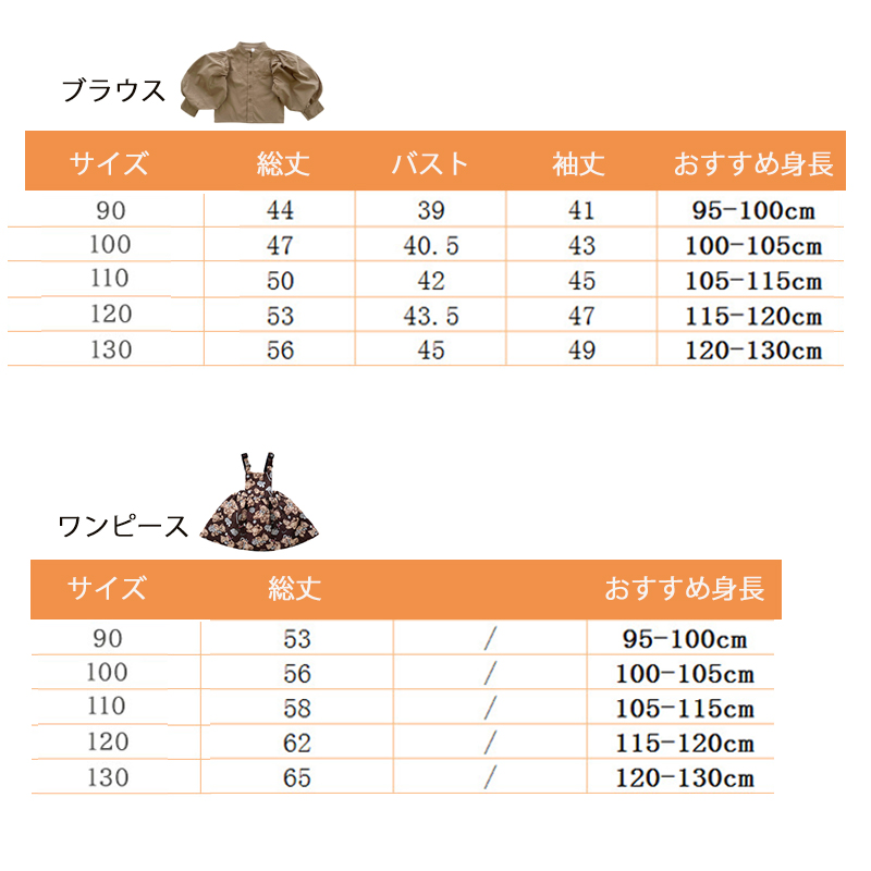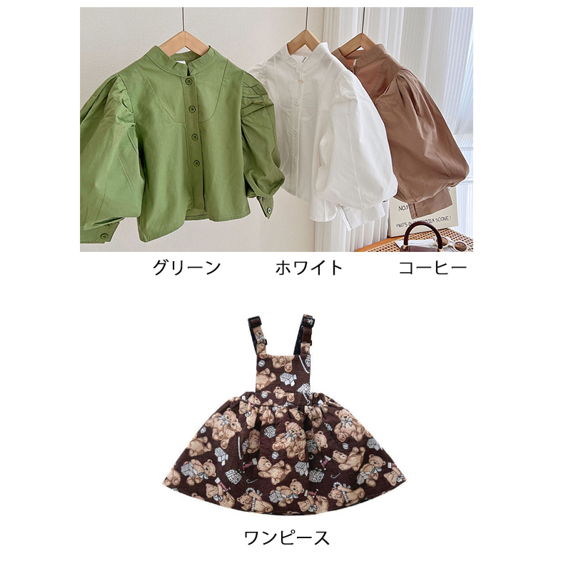 ■コメント 《ブラウス≫ ・トレンドのボリューム袖がお洒落アクセント。 ・立ち襟デザインでレイヤードスタイルにもオススメ。 ・ゆったりの作りで窮屈感がなく動きやすいです。 《ワンピース≫ ・クマさんの模様がキュートで存在感抜群。 ・フワッと広がって女の子らしさをアップさせてくれるシルエット。 ■サイズ(単位:約cm) 画像に記載 ■カラー 画像に記載 ■素材 ブラウス、ワンピース:綿100% ■伸縮性 なし ■裏地 なし ■生地の厚さ 普通 ■透け感 なし