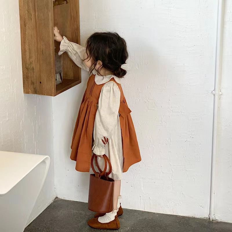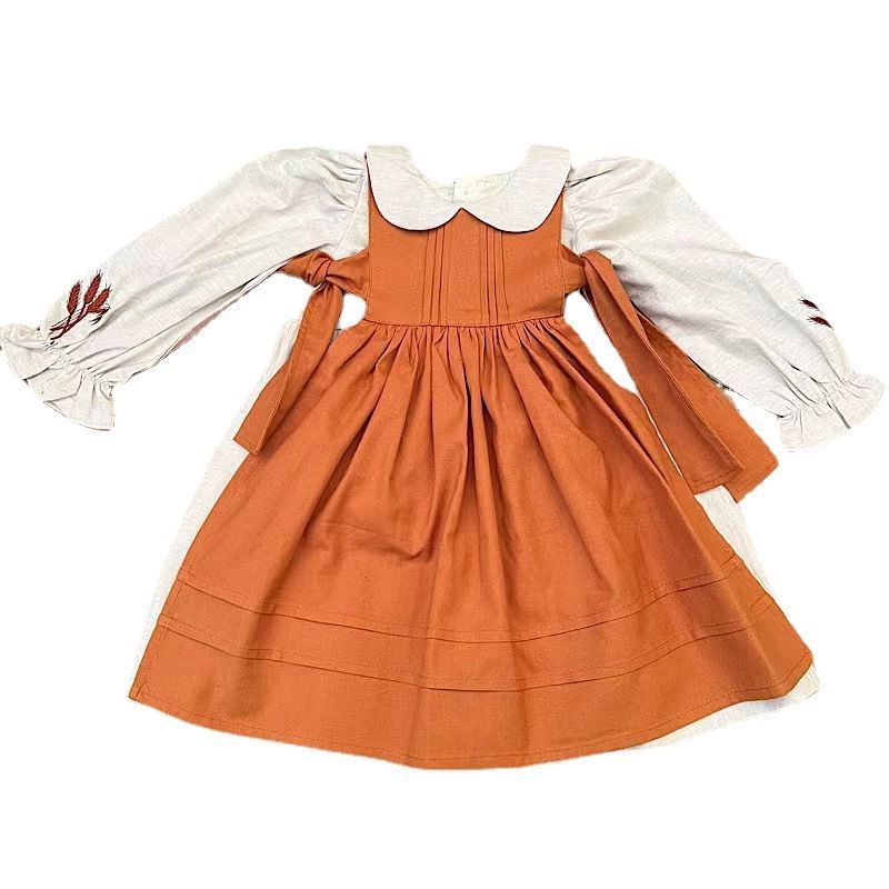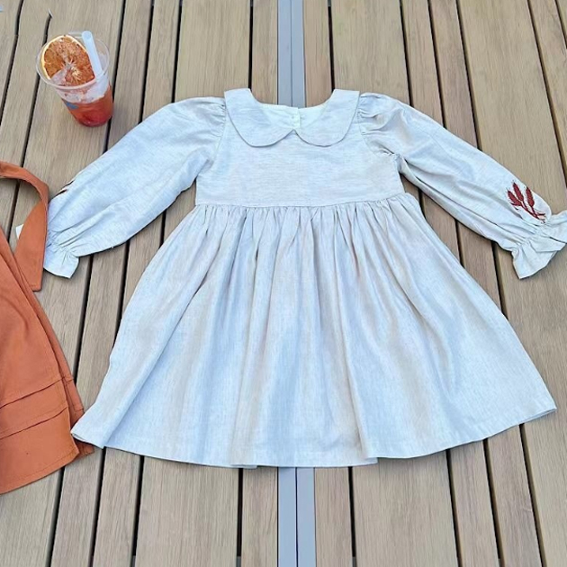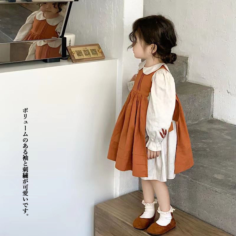 ※エプロンワンピースは別販売です。 ■コメント ・ナチュラルな雰囲気のワンピースです。 ・裾に向かってふんわり広がるスタイルです。 ・ボリュームのある袖と刺繍が可愛いです。 ・ネック周りに丸い襟が付き、上からカーディガンやセーターを着るのもおすすめです。 ■サイズ(単位:約cm) 90 着丈約49.5 胸囲約29.5 袖丈約35.5 100 着丈約53 胸囲約31 袖丈約38 110 着丈約56.5 胸囲約32.5 袖丈約40.5 120 着丈約60 胸囲約34 袖丈約43 130 着丈約63.5 胸囲約35.5 袖丈約45.5 ■カラー 綿100% ■伸縮性 なし ■裏地 なし ■生地の厚さ 普通 ■透け感 なし