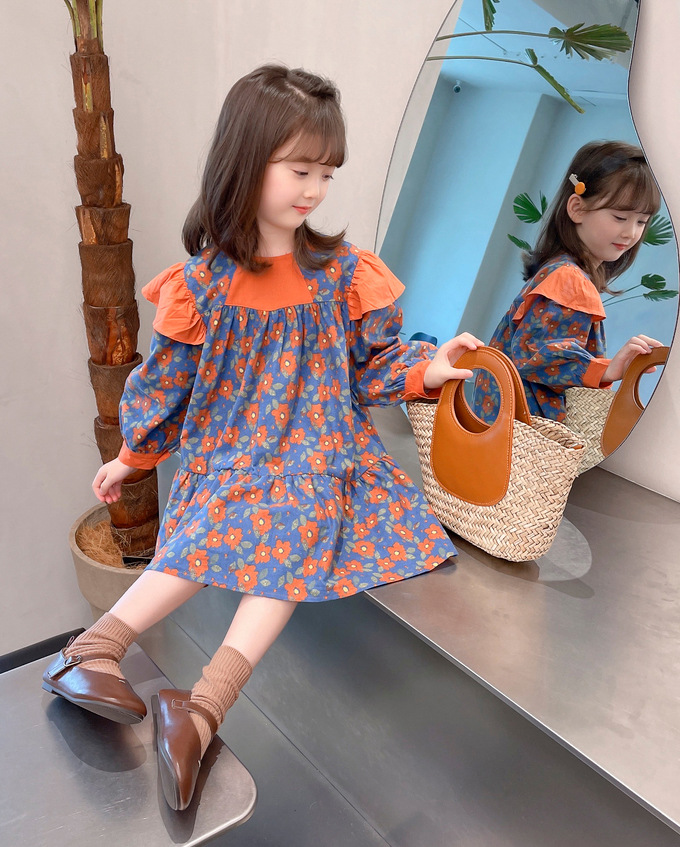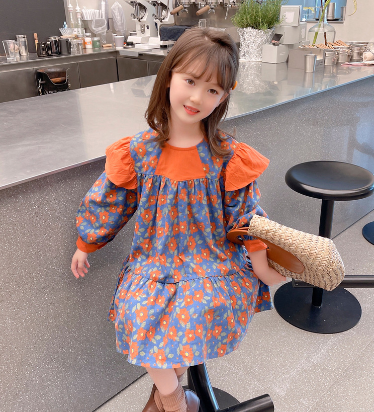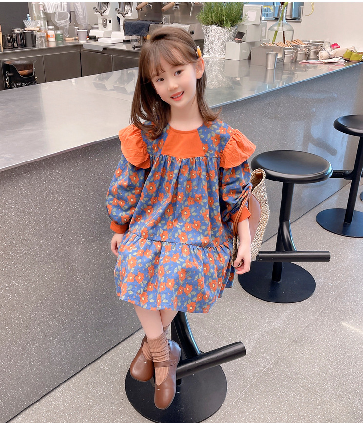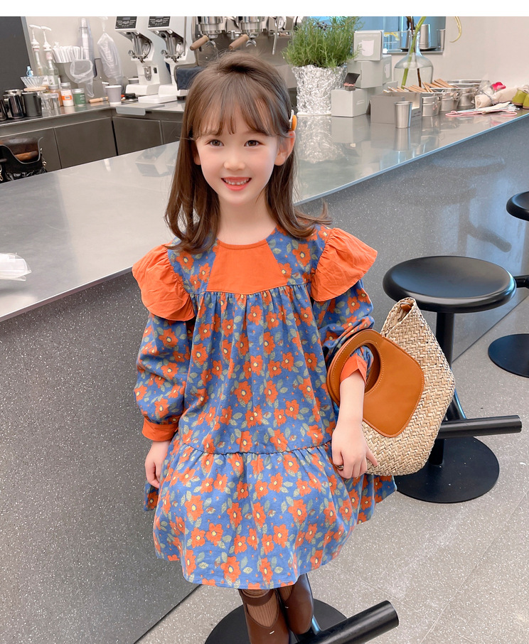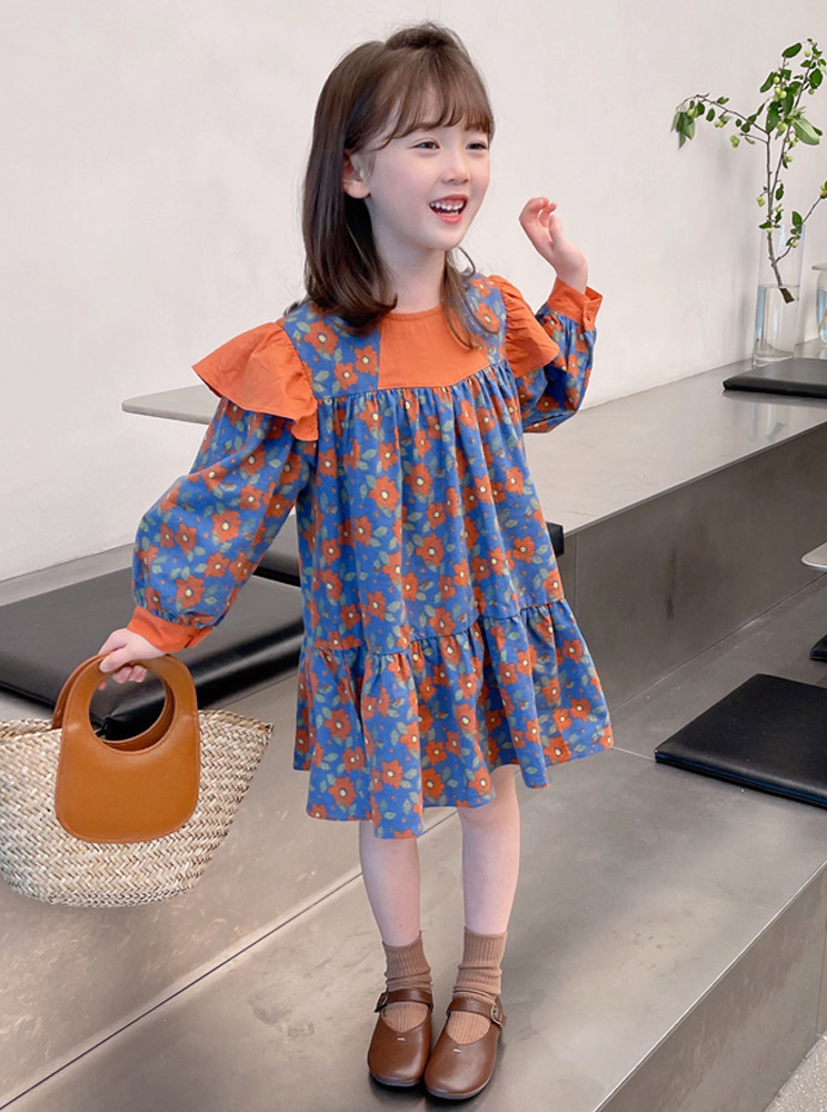 肩部分のフリルデザインがとても愛らしく、青地にオレンジの配色が鮮やかで目を引きます。