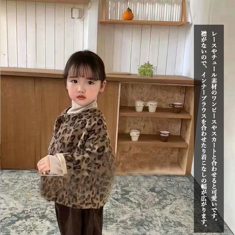 ■コメント ・暖かいフェイクファー素材のキッズジャケットです。 ・一枚でも存在感のあるヒョウ柄。 ・レースやチュール素材のワンピースやスカートと合わせると可愛いです。 ・襟がないので、インナーブラウスを合わせたり着こなしの幅が広がります。 ■サイズ(単位:約cm) 90 着丈約40 バスト約38 100 着丈約42 バスト約40 110 着丈約45 バスト約43 120 着丈約48 バスト約46 130 着丈約51 バスト約49 ■カラー ポリエステル100% ■伸縮性 なし ■裏地 なし ■生地の厚さ 普通 ■透け感 なし