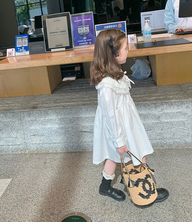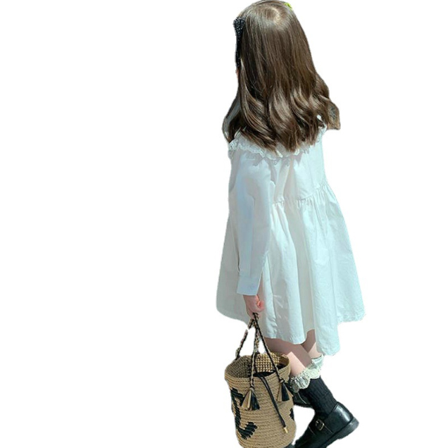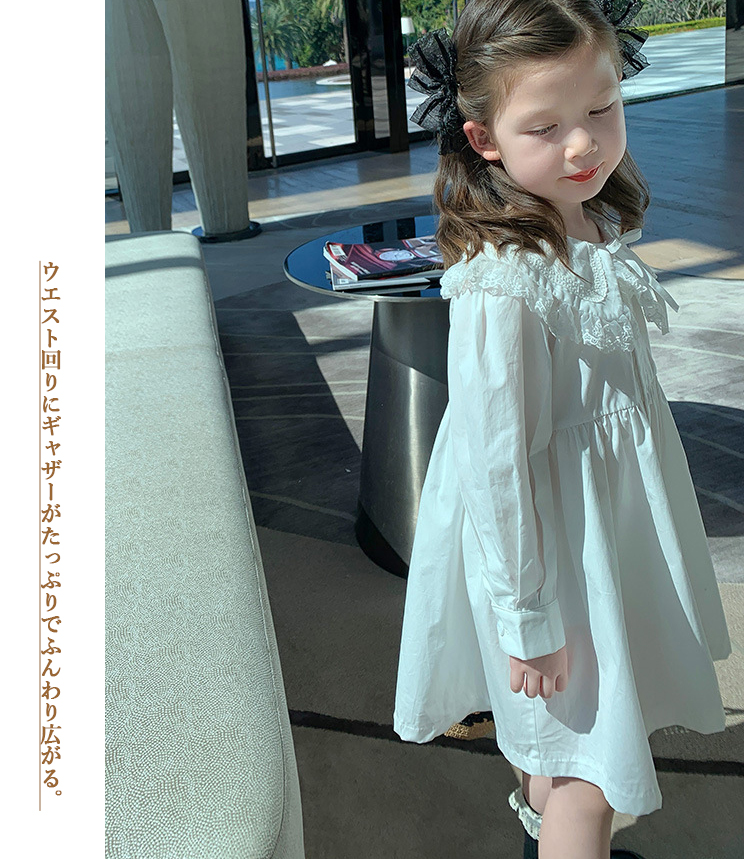 上品なレースフリル襟が印象的なキッズ用白色ロングワンピースです。