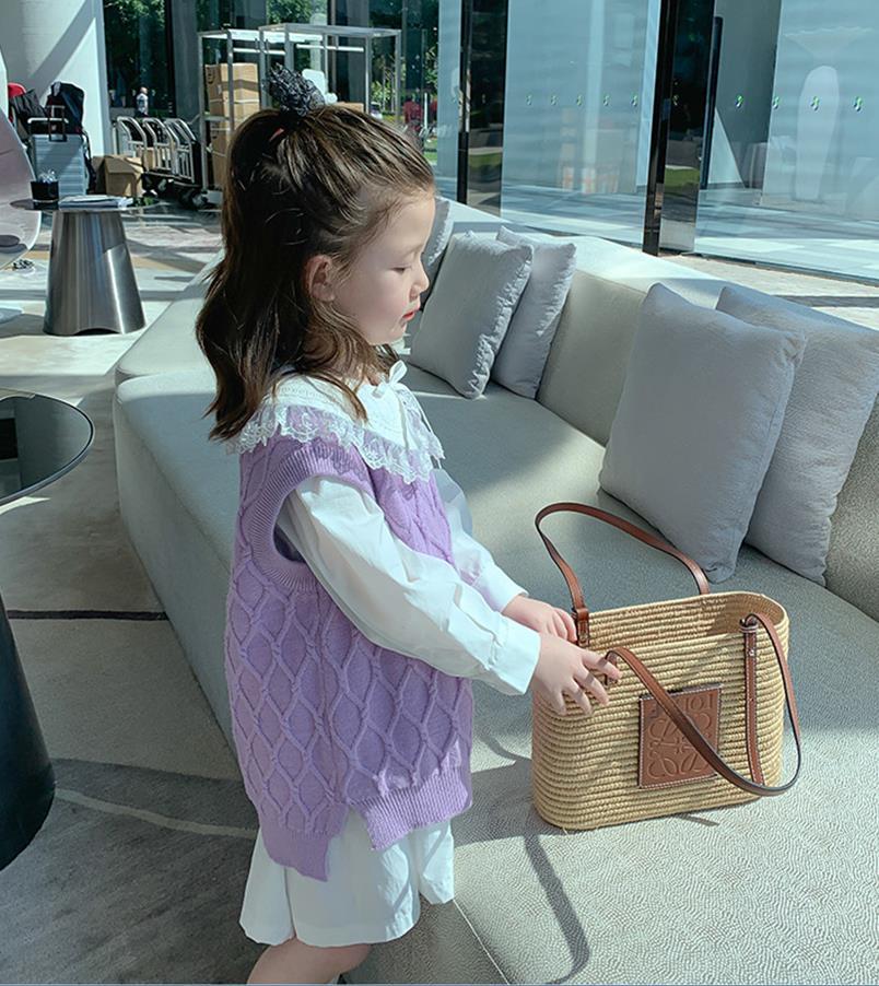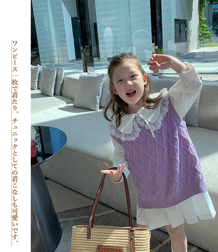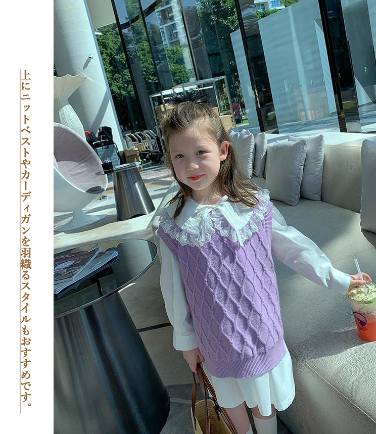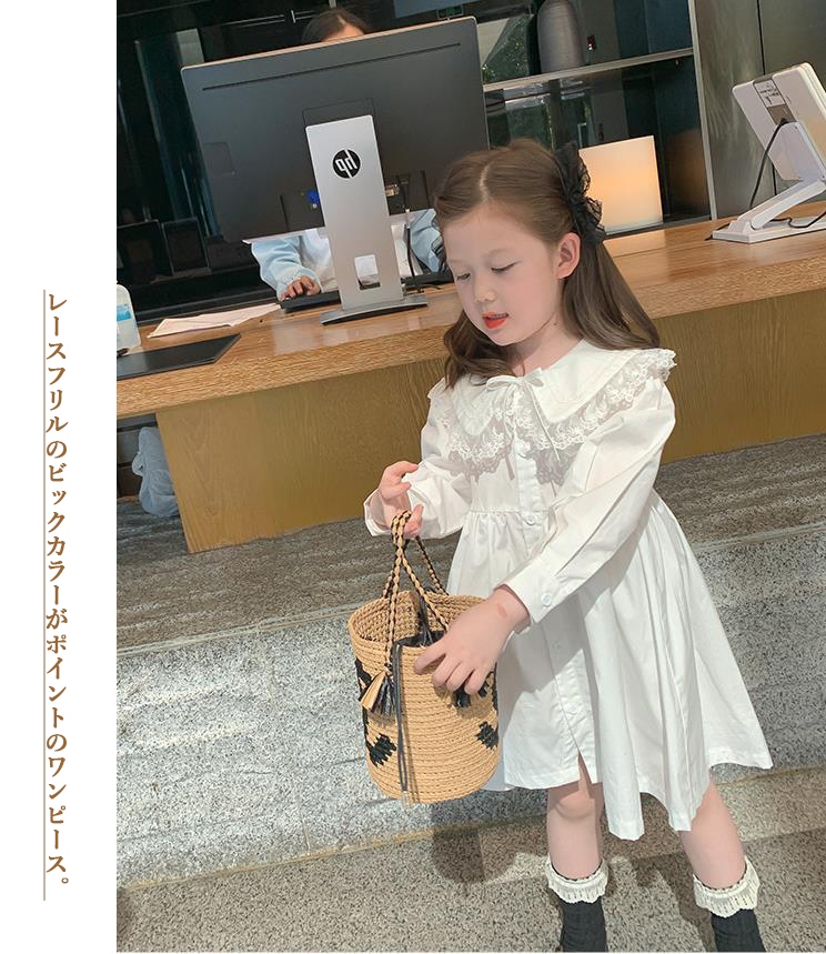 ■コメント ・レースフリルのビックカラーがポイントのワンピース。 ・ウエスト回りにギャザーがたっぷりでふんわり広がる。 ・ワンピース一枚で着たり、チュニックとしての着こなしも可愛いです。 ・上にニットベストやカーディガンを羽織るスタイルもおすすめです。 ■サイズ(単位:約cm) 90 着丈約46 バスト約31 袖丈30 100 着丈約49 バスト約33 袖丈33 110 着丈約52 バスト約35 袖丈35 120 着丈約55 バスト約37 袖丈38 130 着丈約58 バスト約39 袖丈40 ■カラー 綿95%、ポリエステル5% ■伸縮性 なし ■裏地 なし ■生地の厚さ やや薄い ■透け感 あり