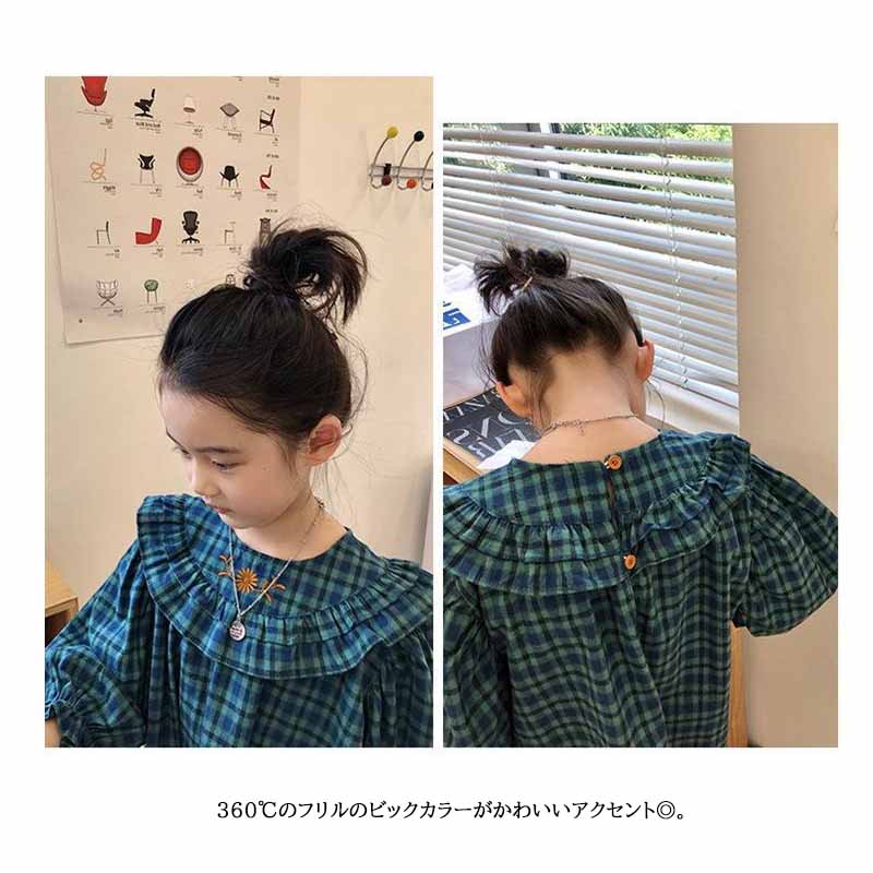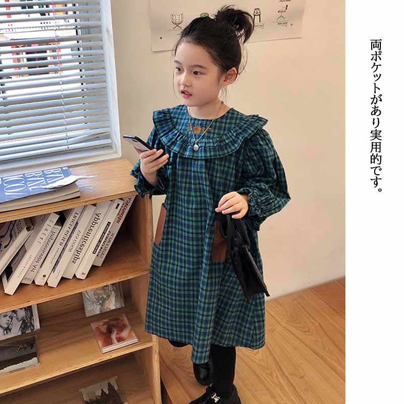 ■コメント ・グリーンのチェック柄長袖ワンピース。 ・360℃のフリルのビックカラーがかわいいアクセント◎。 ・落ち着いた雰囲気のワンピースでフォーマルシーンにもオススメです。 ・両ポケットがあり実用的です。 ■サイズ(単位:約cm) 90 着丈約54 バスト約84 100 着丈約58 バスト約88 110 着丈約61 バスト約94 120 着丈約65 バスト約96 130 着丈約68 バスト約102(OK) ■カラー 綿95%、ポリエステル5% ■伸縮性 なし ■裏地 なし ■生地の厚さ 普通 ■透け感 なし