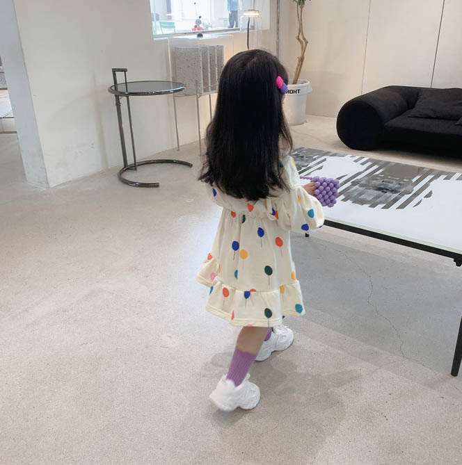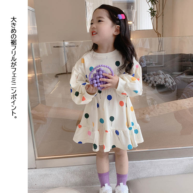 ■コメント ・ハートと風船がいっぱいのデザインで女の子らしさUP。 ・大きめの裾フリルがフェミニンポイント。 ・ウエストあたりの切替ギャザーがきれいなシルエットを作り出します。 ・1枚ではもちろん、シンプルめのアウターやカーディガンなどと合わせてもかわいいです。 ■サイズ(単位:約cm) 90 着丈約48 100 着丈約52 110 着丈約56(OK) 120 着丈約60 130 着丈約63 ■カラー 綿65%、ポリエステル35% ■伸縮性 なし ■裏地 なし ■生地の厚さ 普通 ■透け感 なし