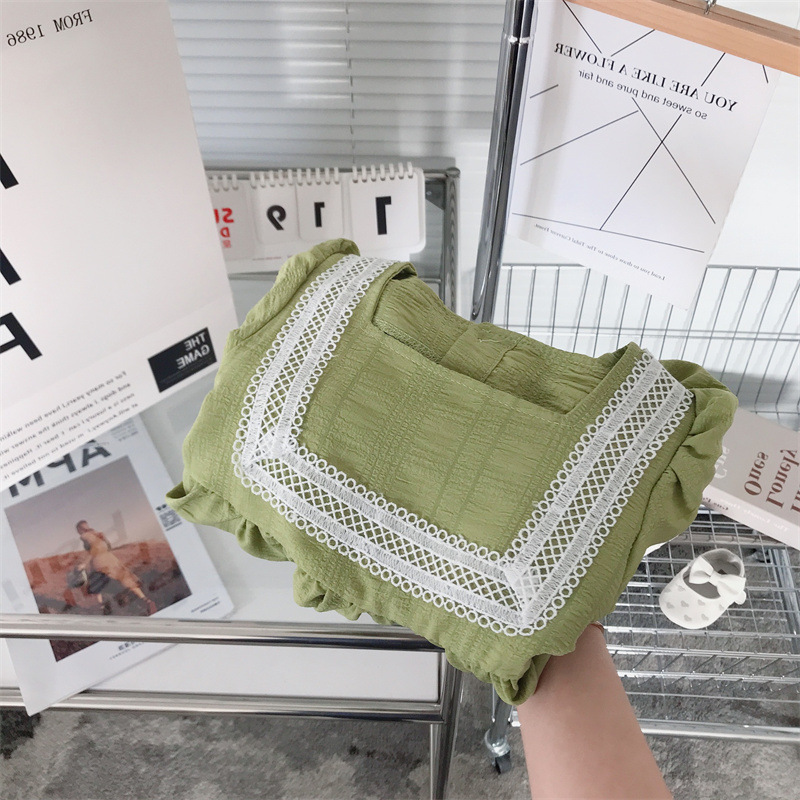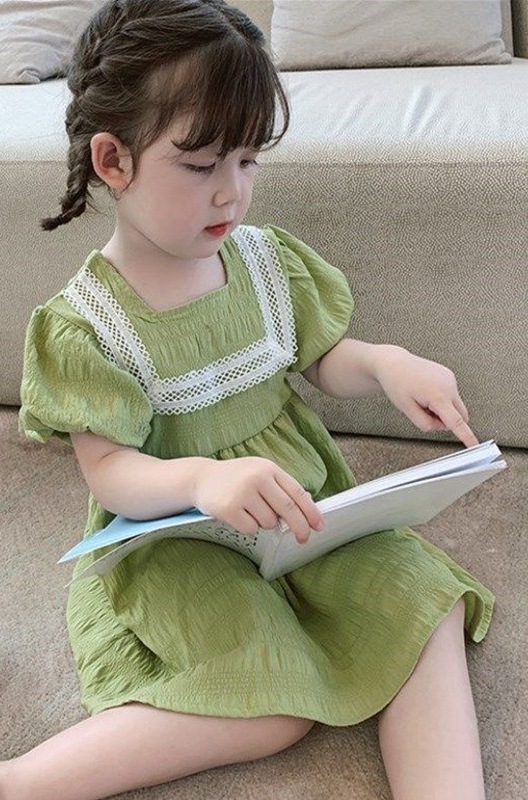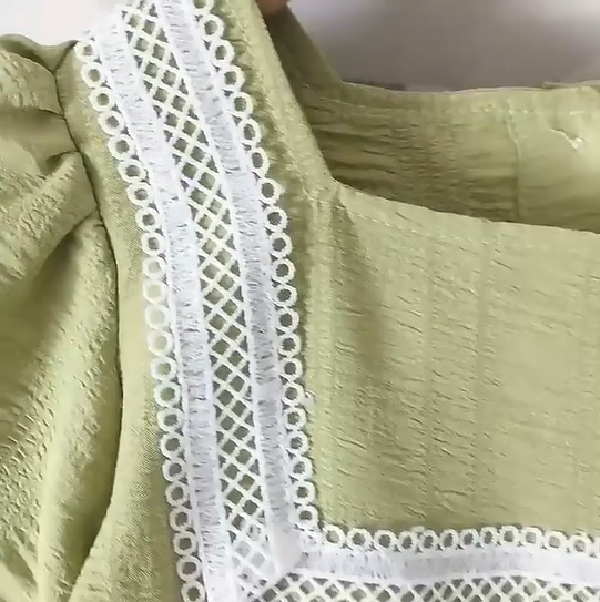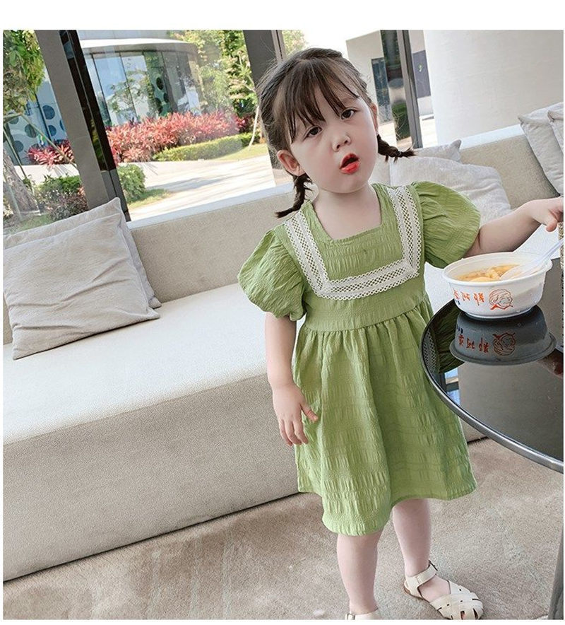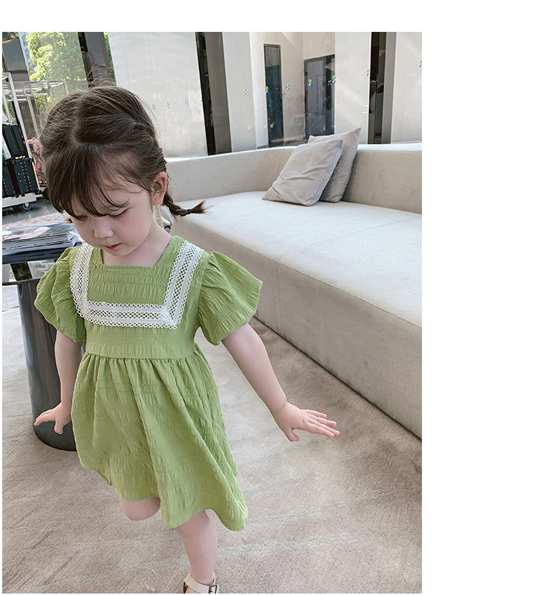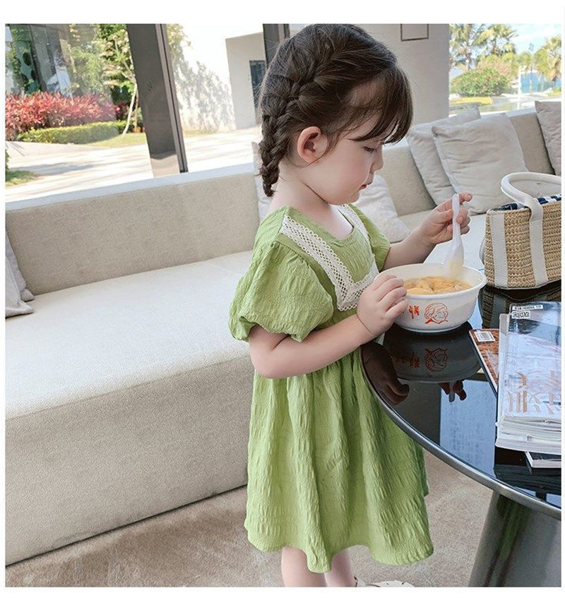 ■コメント ・グリーンカラーが爽やかで綺麗。 ・ふんわりとしたシルエットのパフ袖。 ・胸元のレースが上品で特別なお出かけにも合います。 ・バックボタンでの着脱です。 ■サイズ(単位:約cm) 90cm 着丈約54 バスト約58 100cm 着丈約58 バスト約66 110cm 着丈約61 バスト約68 120cm 着丈約65 バスト約72 130cm 着丈約68 バスト約74 ■カラー グリーン ■伸縮性 なし ■裏地 なし ■生地の厚さ 普通 ■透け感 なし ■素材 綿90%、ポリエステル10%