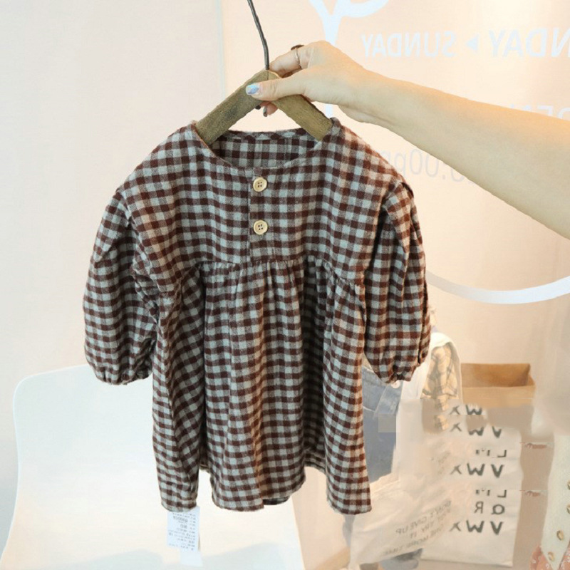 女の子らしい丸襟とバルーン袖のデザインで、フロントボタンがアクセントになっています。