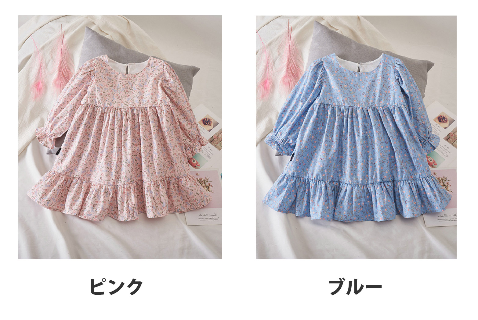 袖口と裾のフリルデザインが女の子らしい可愛さを演出します。