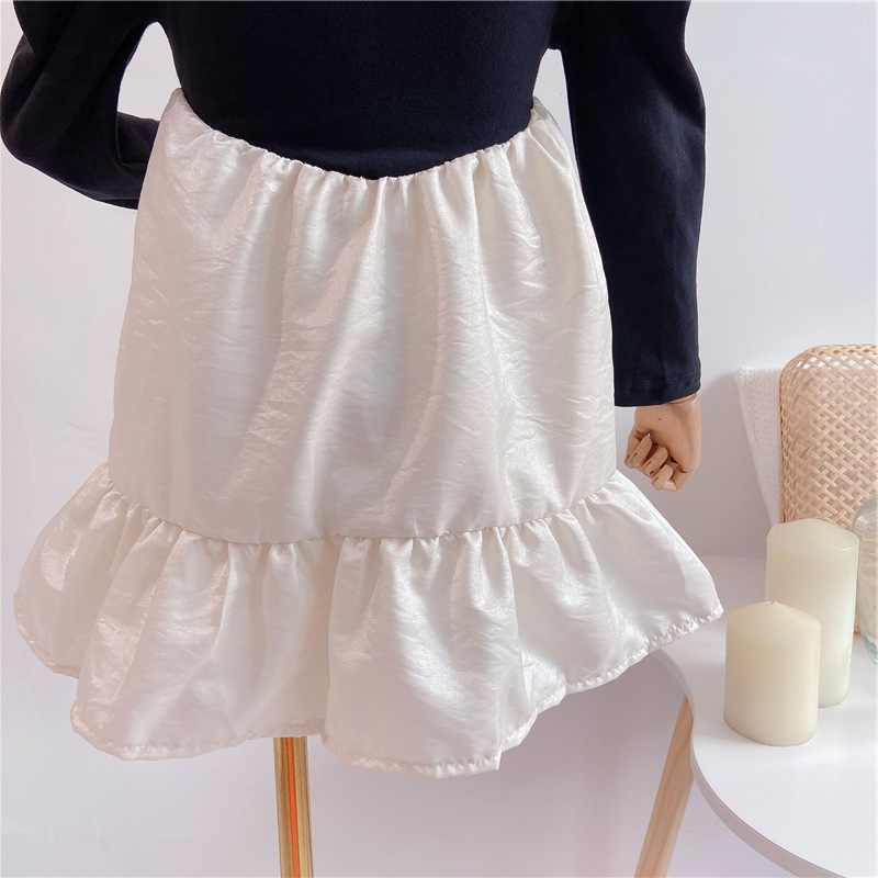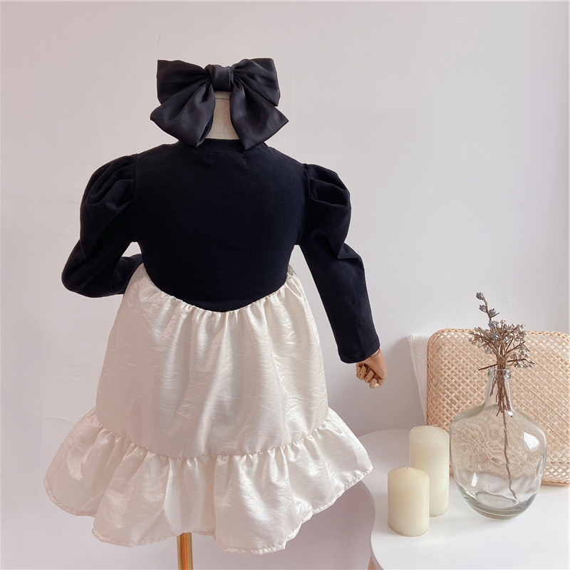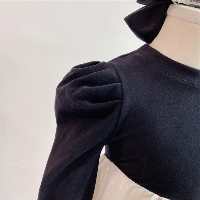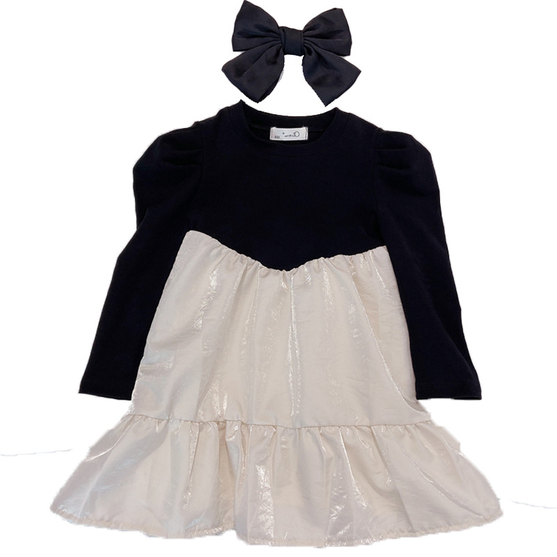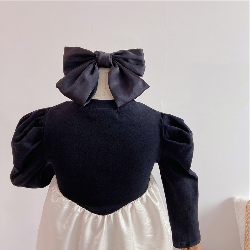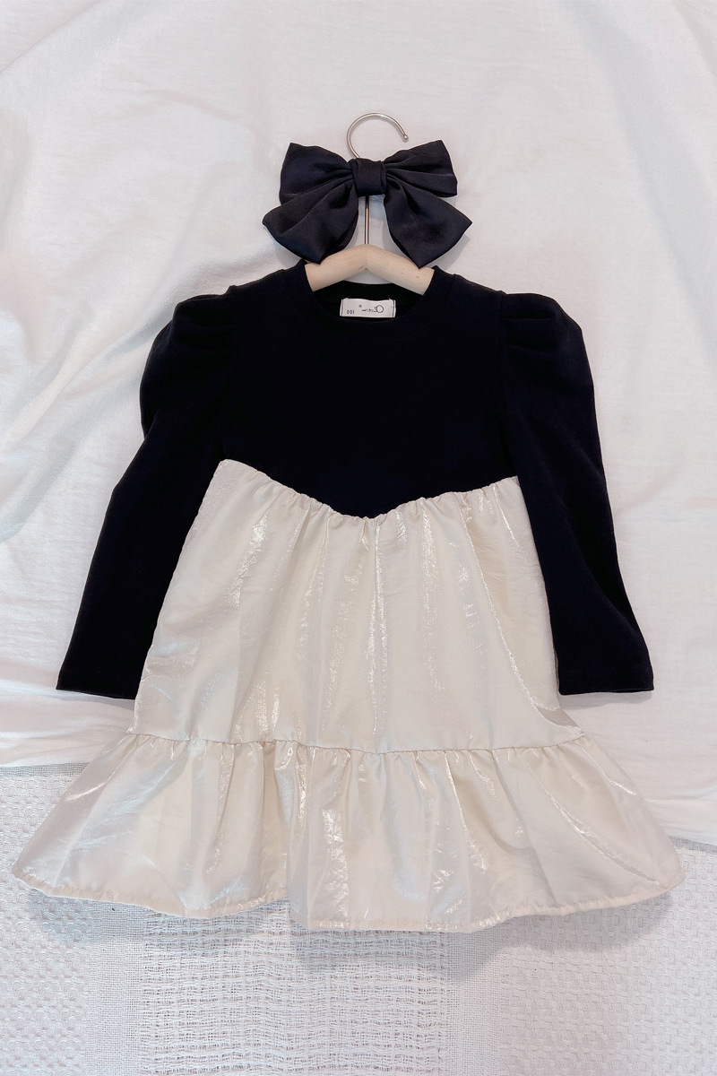 上品な黒のトップスと光沢感のある白いスカートが美しいキッズ用ロングワンピースです。