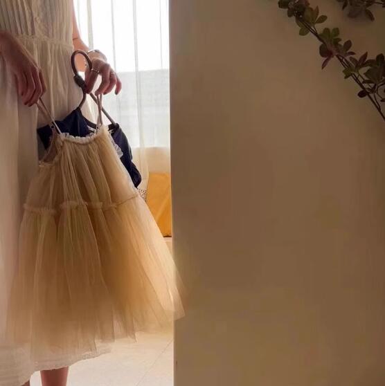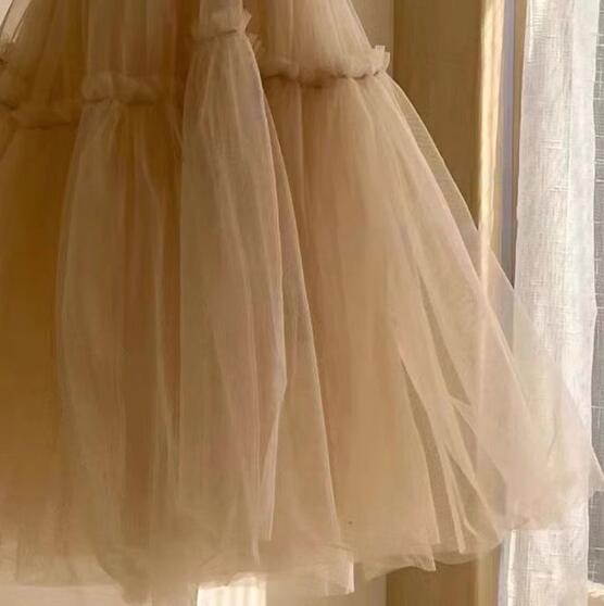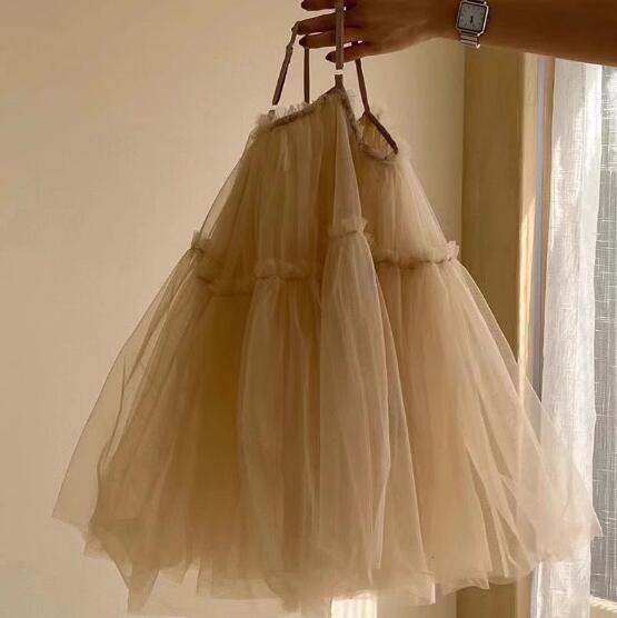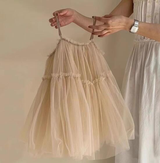 ふんわりとしたチュール素材が美しいキッズ用肩紐ワンピースです。
