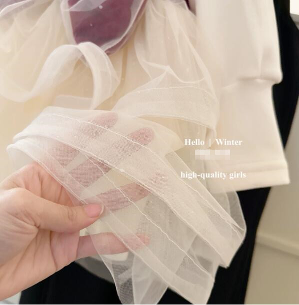 胸元の大きな蝶結びリボンと襟元のパール風装飾が可愛らしさを引き立てます。