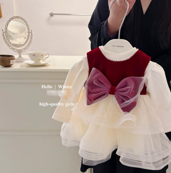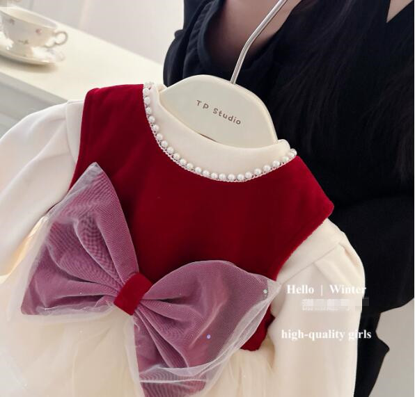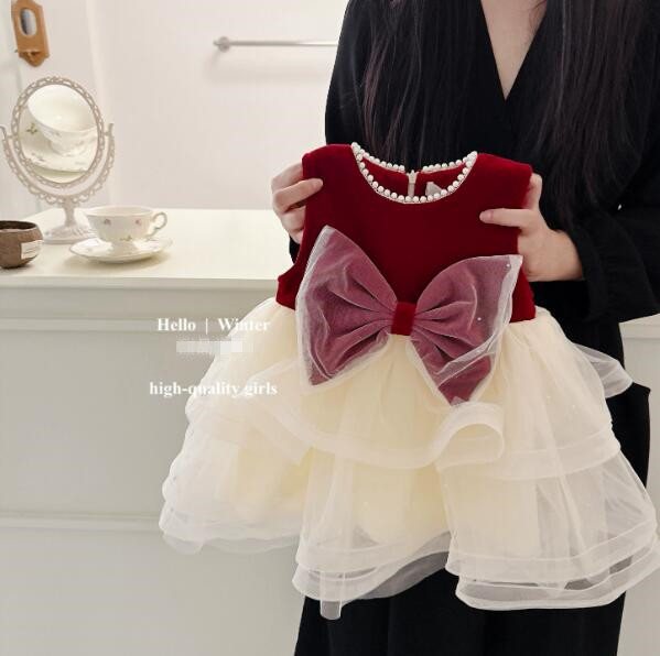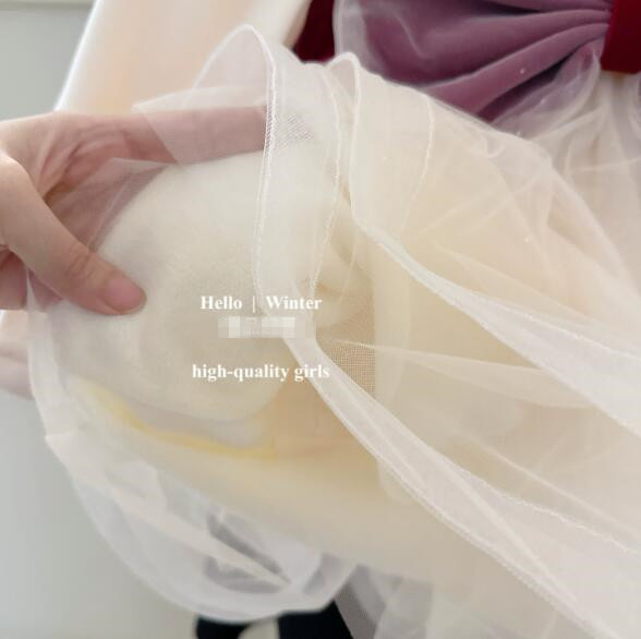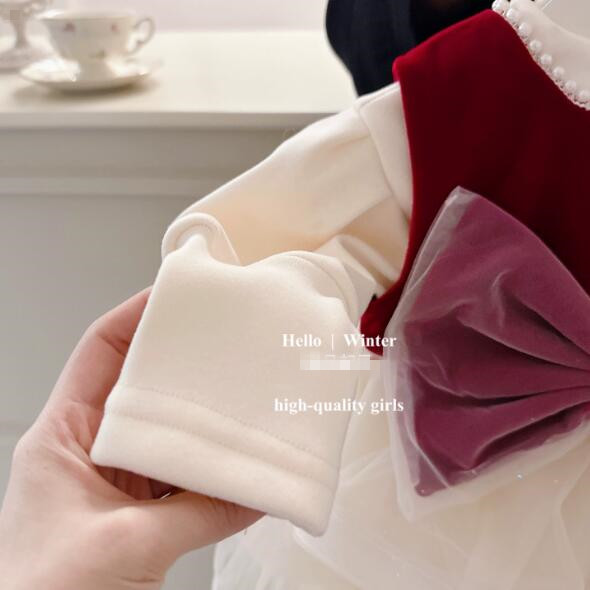 深紅のベルベット風素材と白いチュールスカートが上品な印象を演出します。