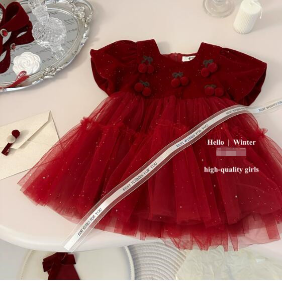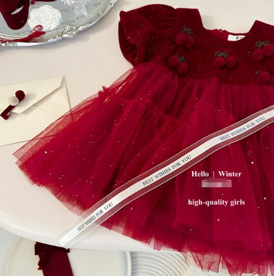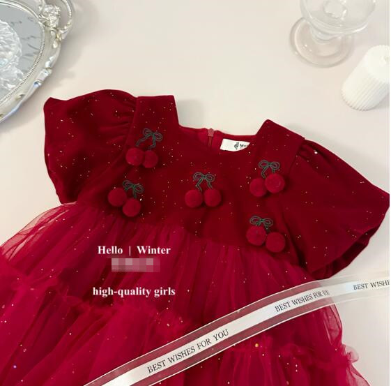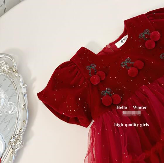 可愛いさくらんぼの刺繍が胸元を飾る、上品な赤いキッズ用ロングワンピースです。