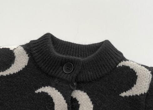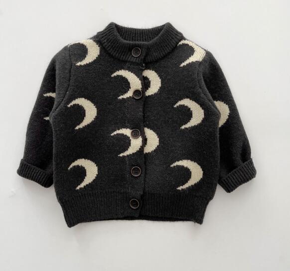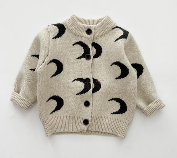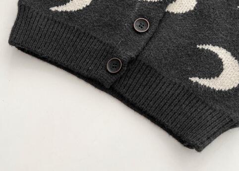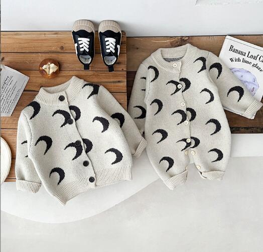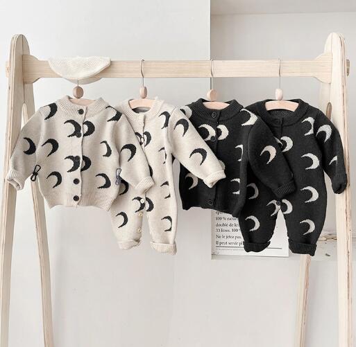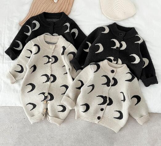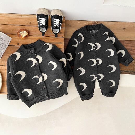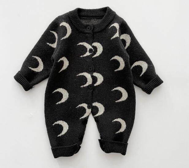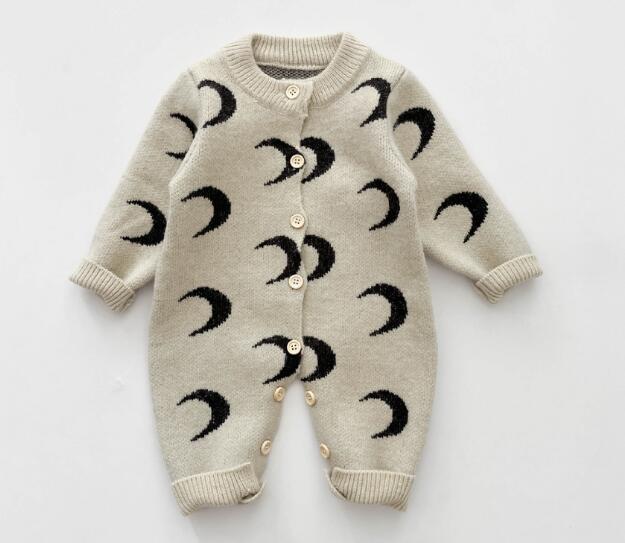 キッズ向けの可愛い月模様が特徴的な新生児用ニットロンパースです。