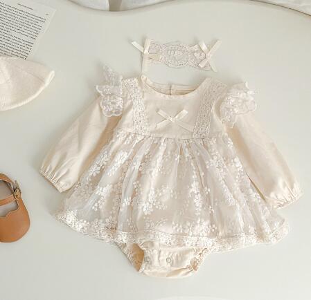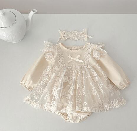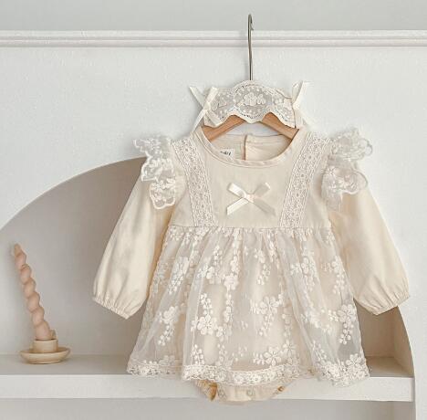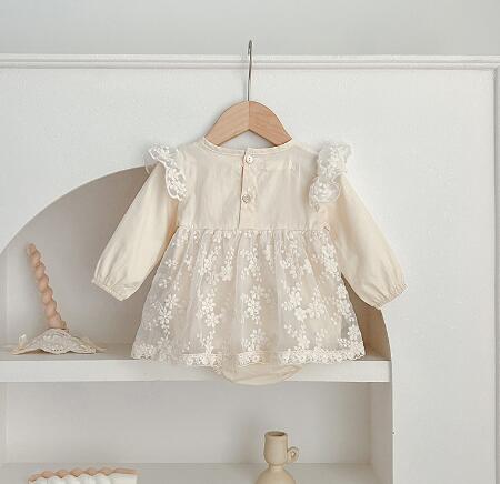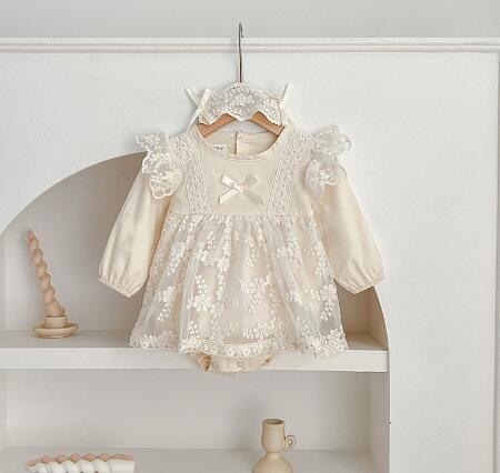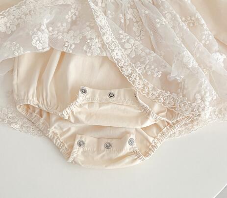 上品なレース刺繍が美しいキッズ用新生児ロンパースワンピースです。