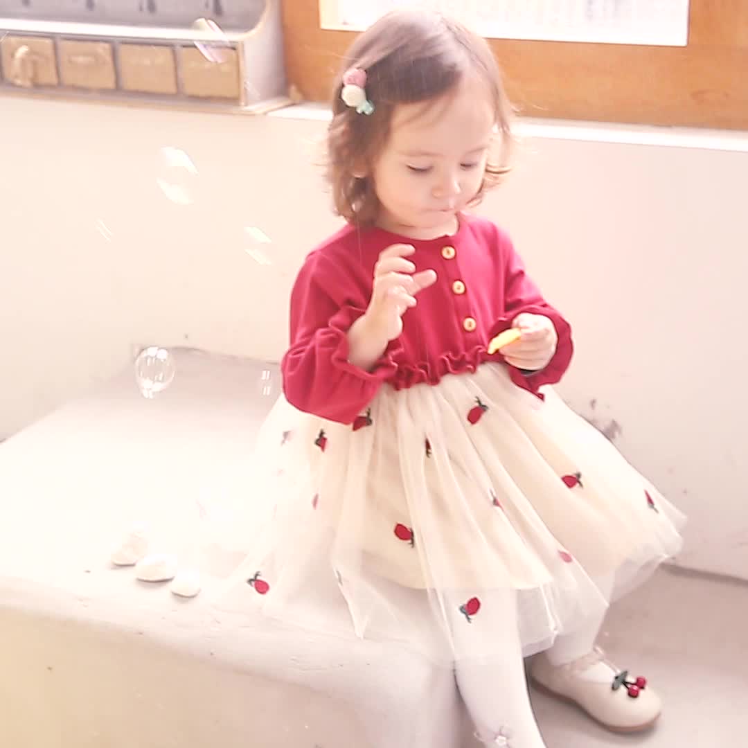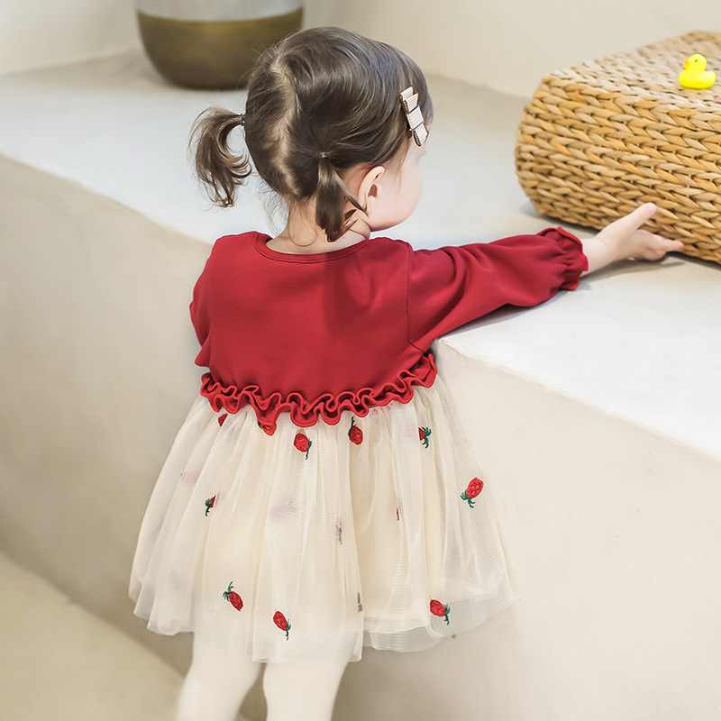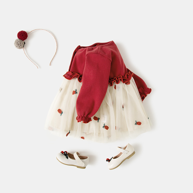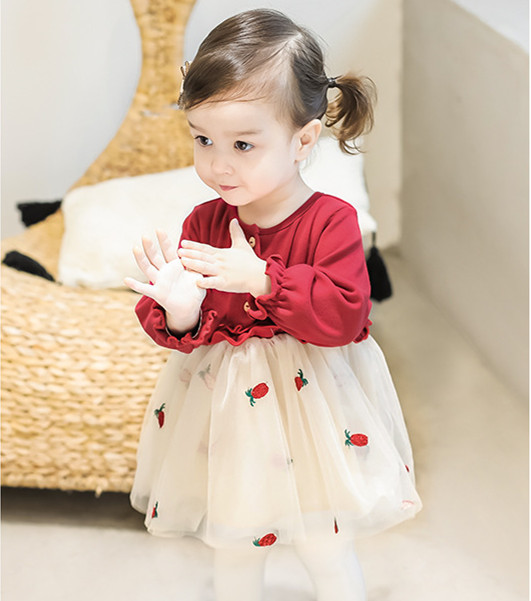 赤いトップスと白いチュール生地の組み合わせが上品で、キッズファッションにぴったりです。