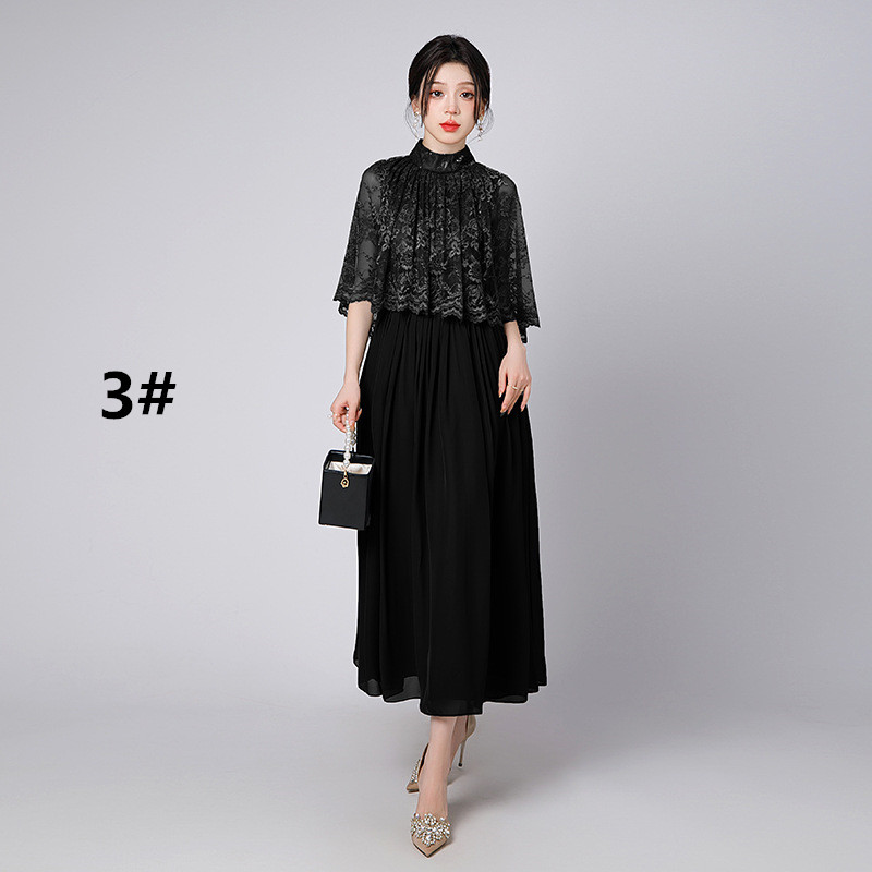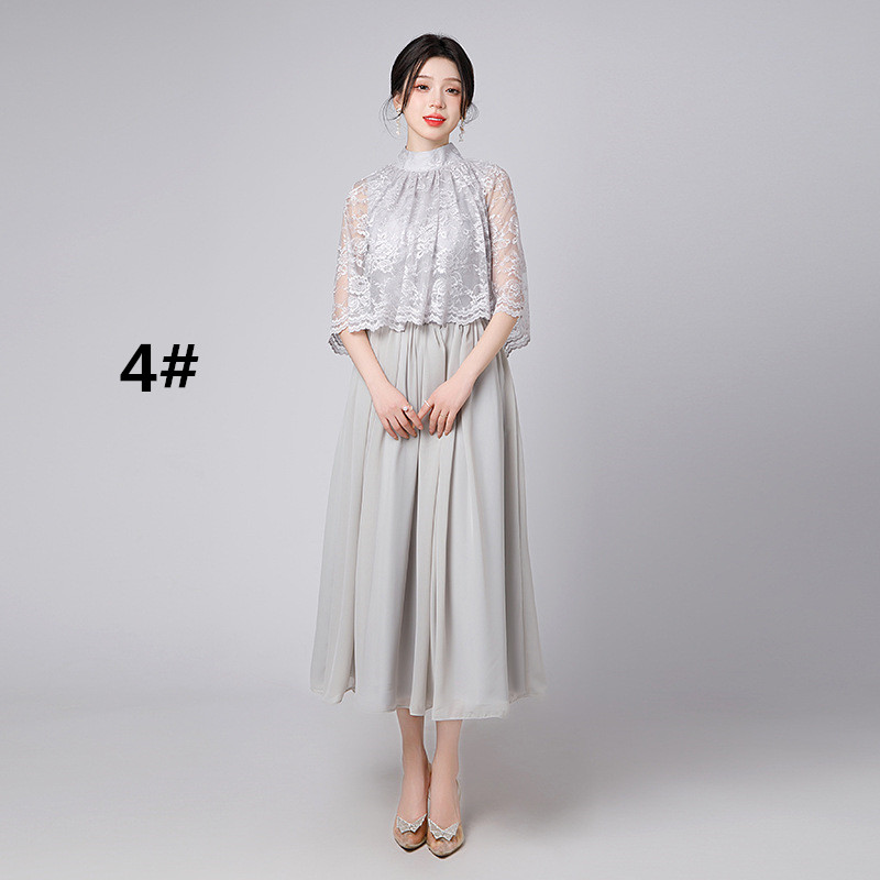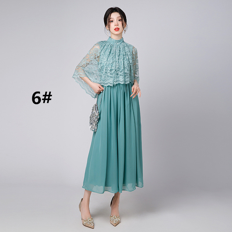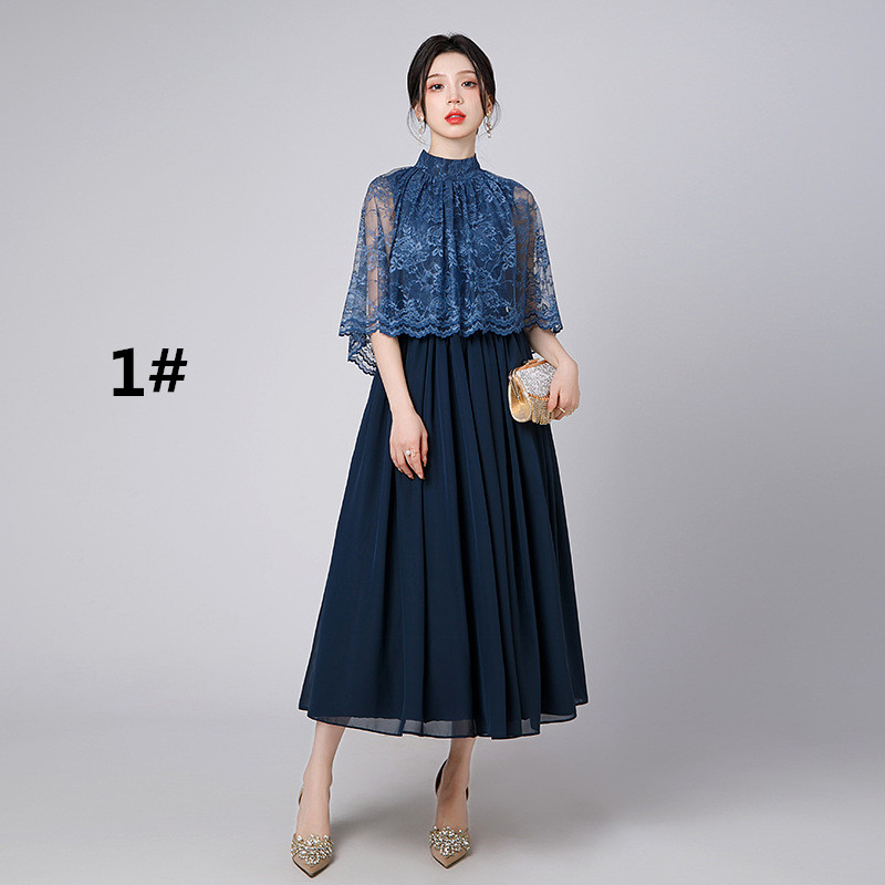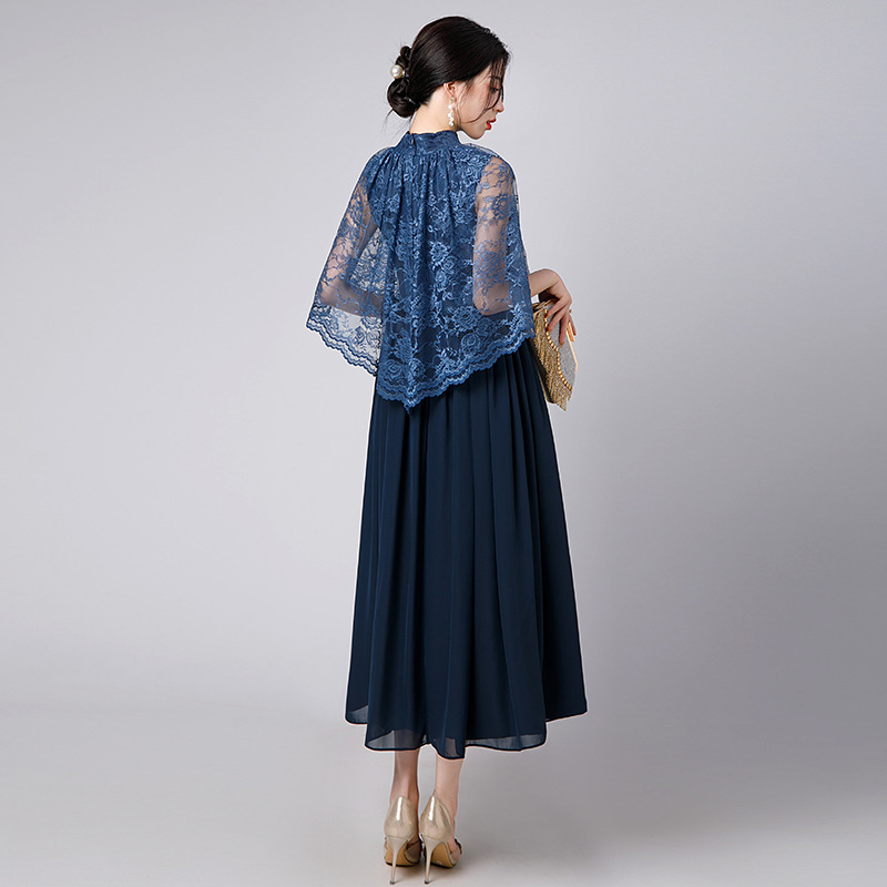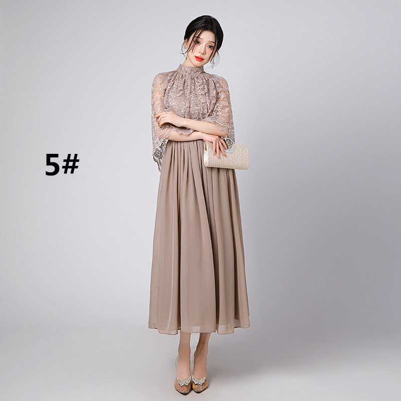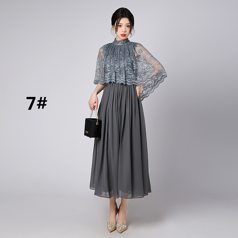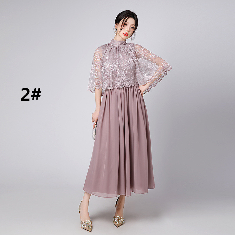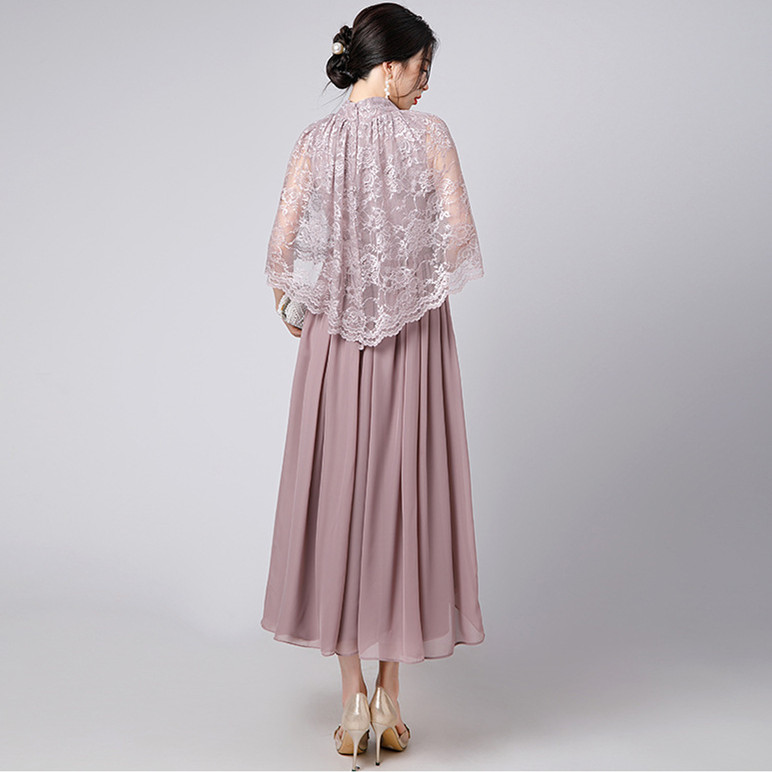 繊細なレースデザインが顔周りを華やかに演出する上品なロングワンピース。