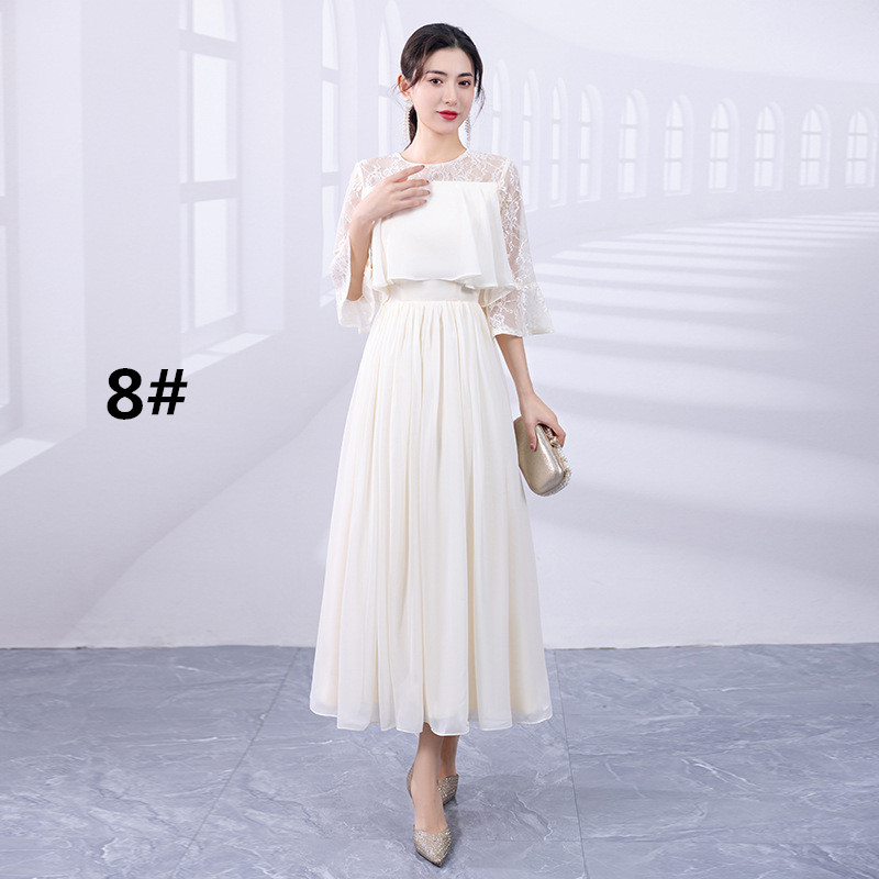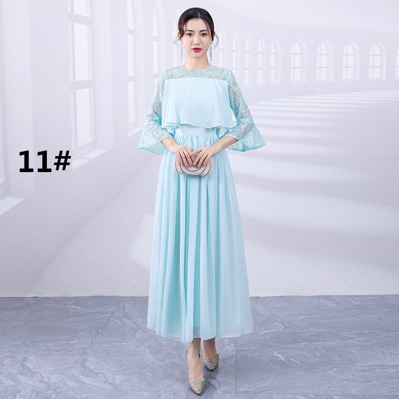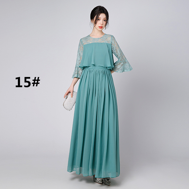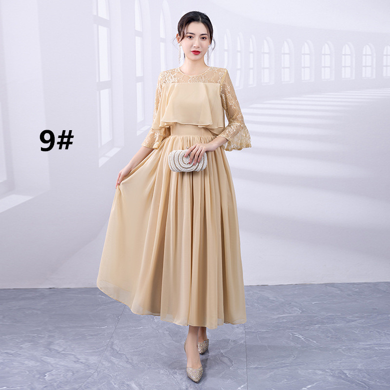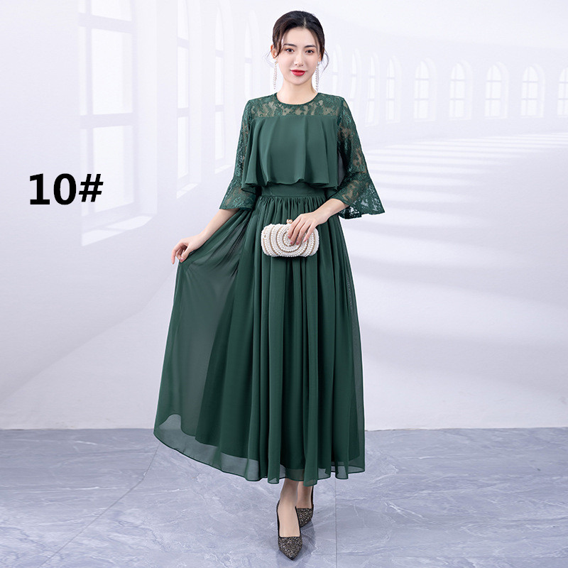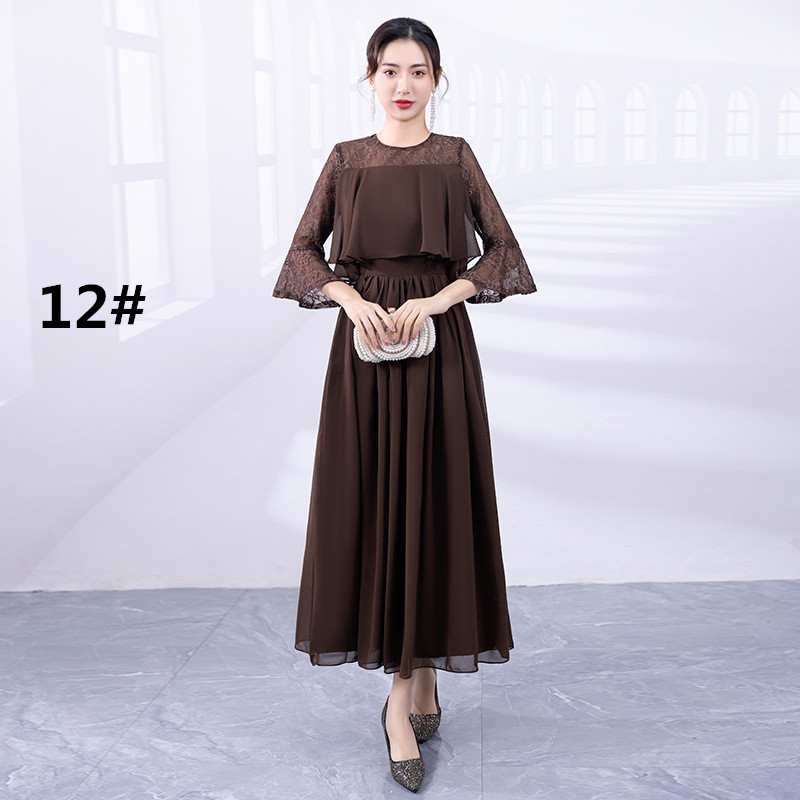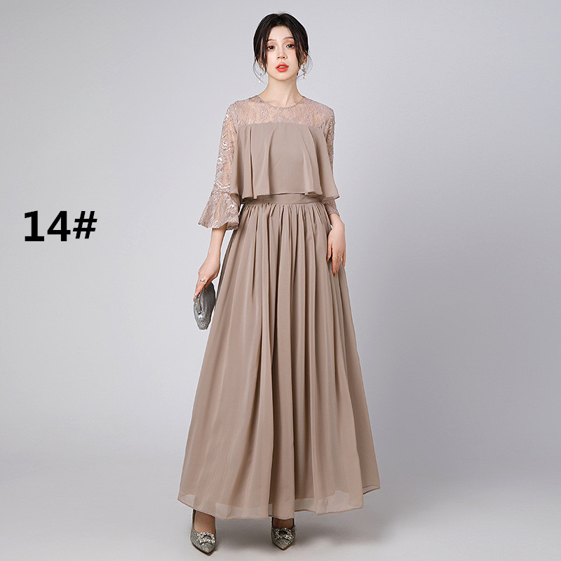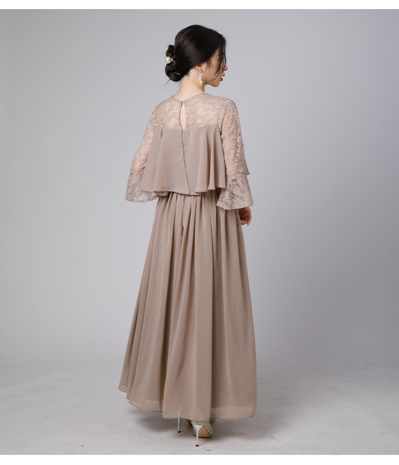 上品なレース袖が美しいロングワンピースで、フォーマルなドレスシーンにぴったり。