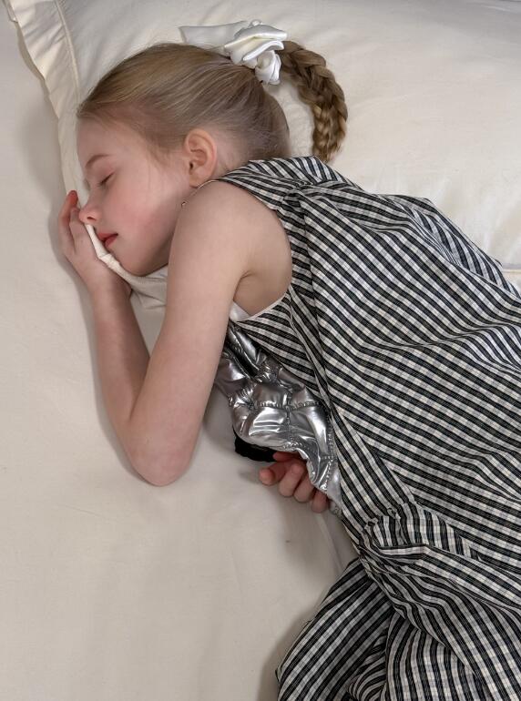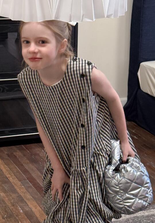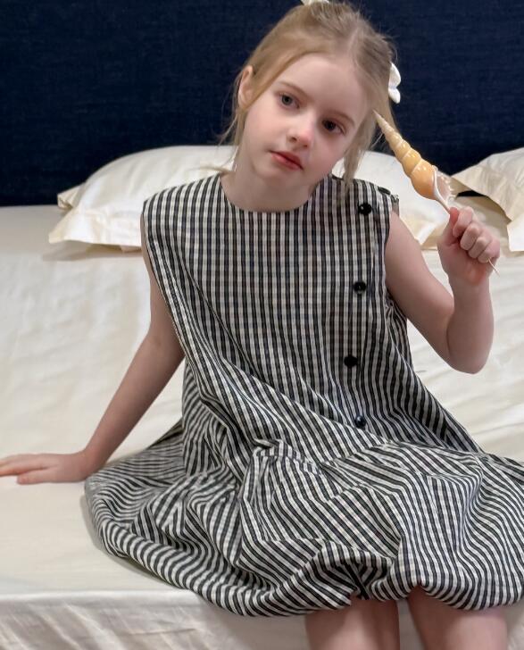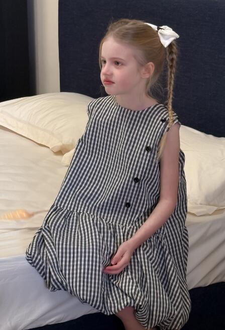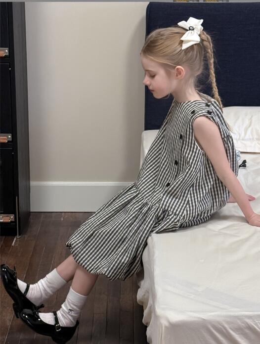 上品な縦縞柄が印象的なキッズ用ロングワンピースです。