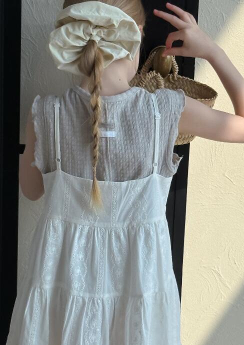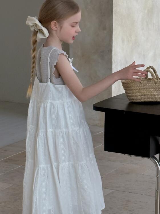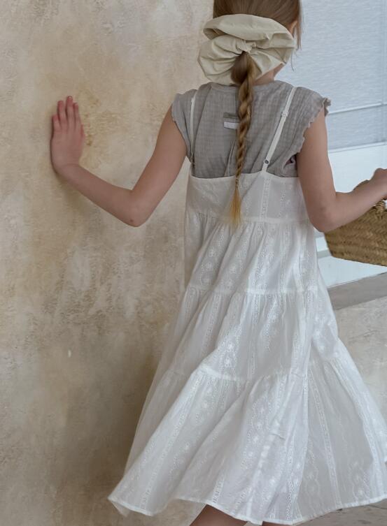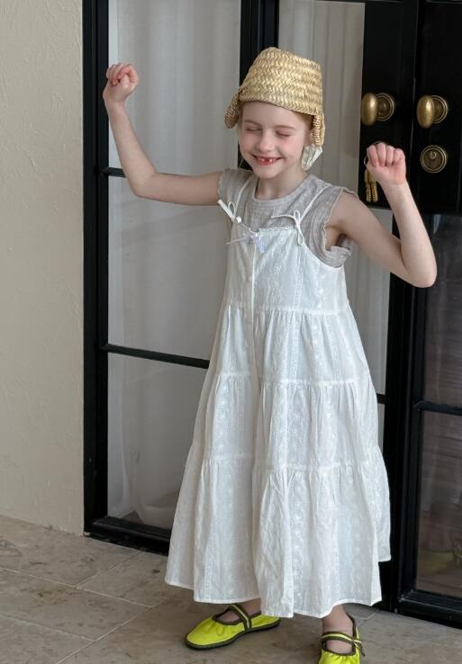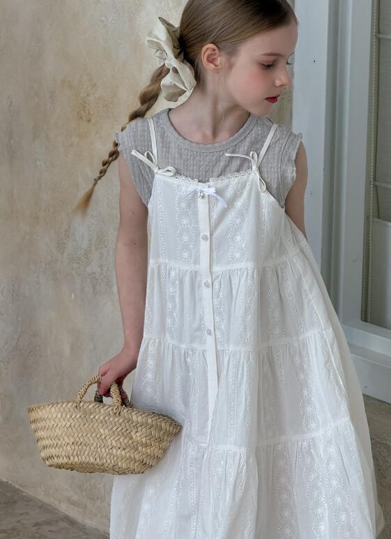 白いレースワンピースとグレーのベストがセットになった可愛いロングワンピース。