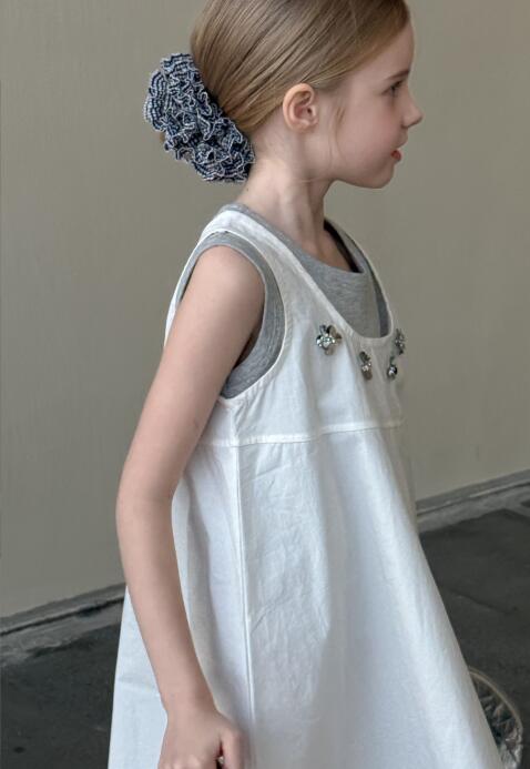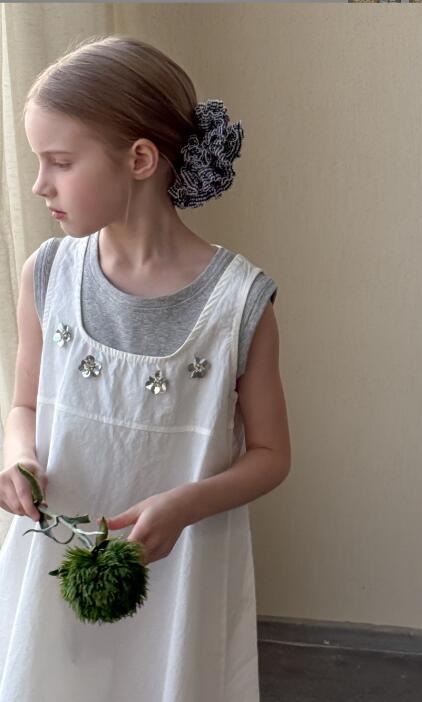 胸元の可愛らしい装飾がポイントの無袖デザインで、夏のお出かけにぴったり。
