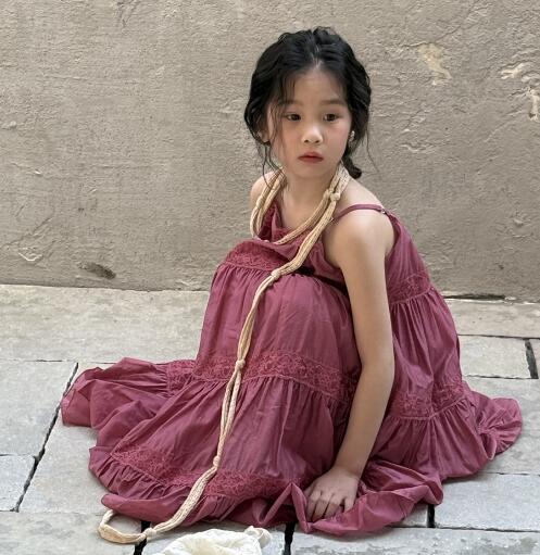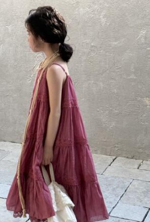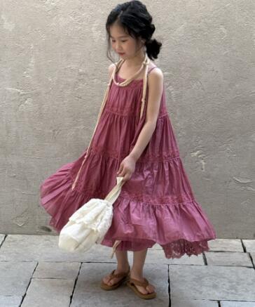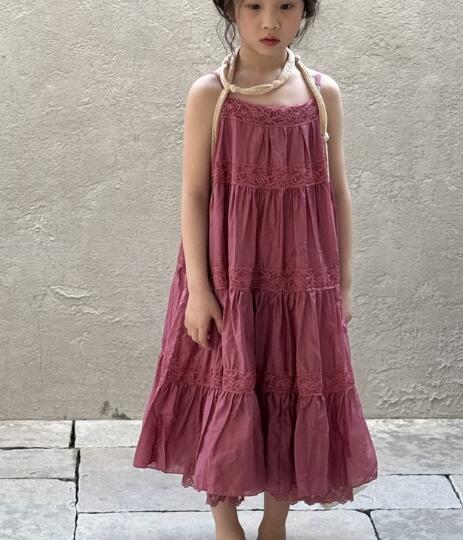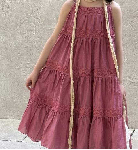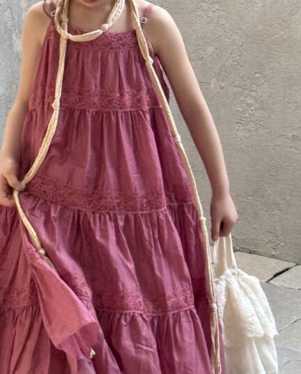 上品なくすみピンクが魅力的なキッズ用ティアードロングワンピース。