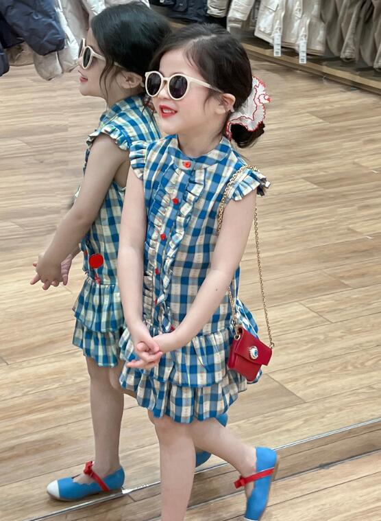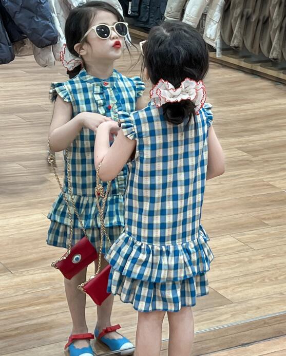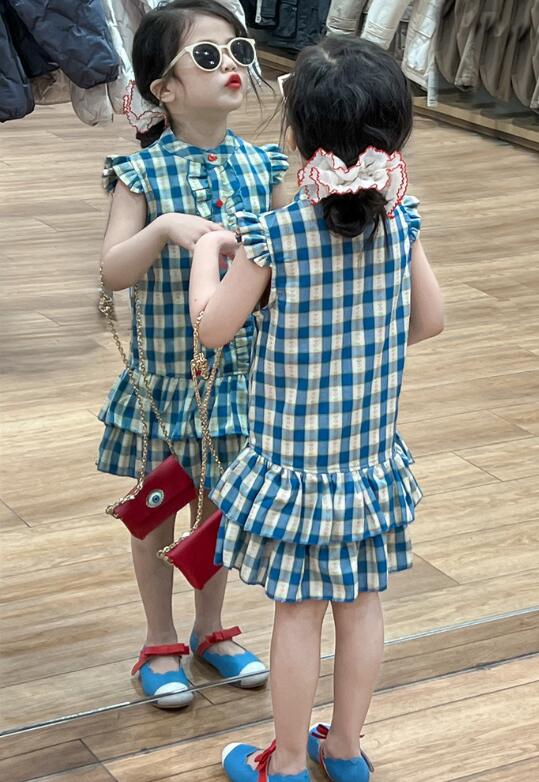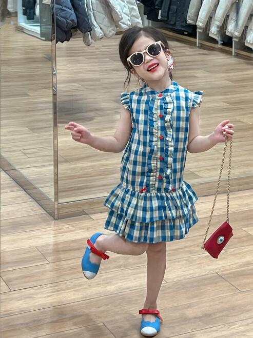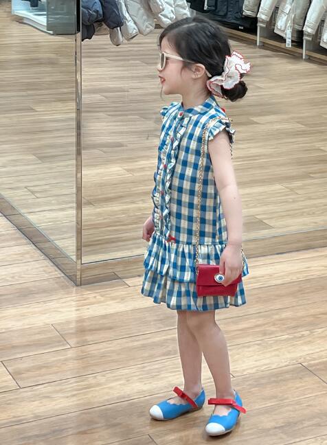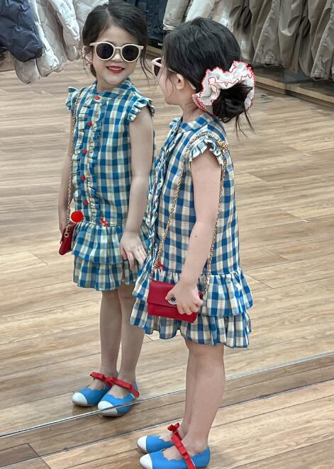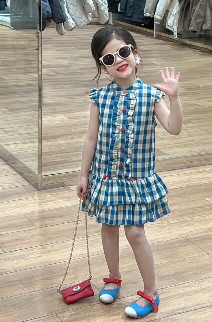 爽やかなブルーチェック柄が印象的なキッズ用ロングワンピースです。