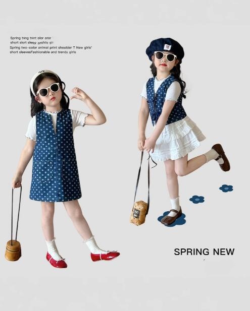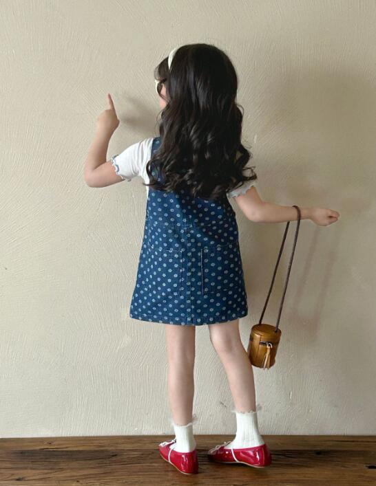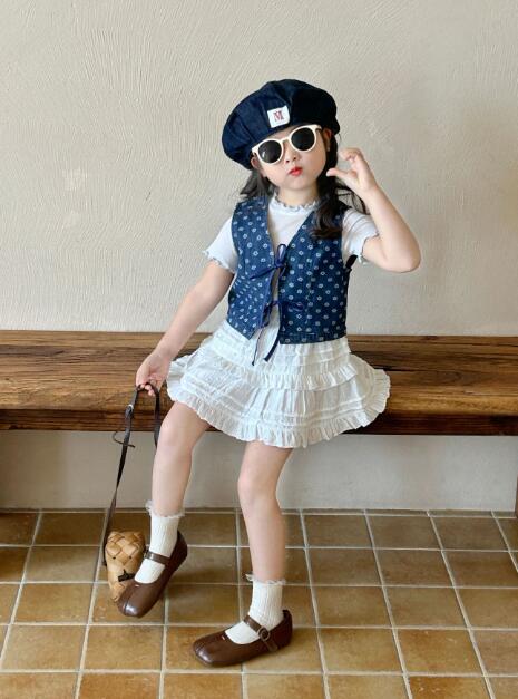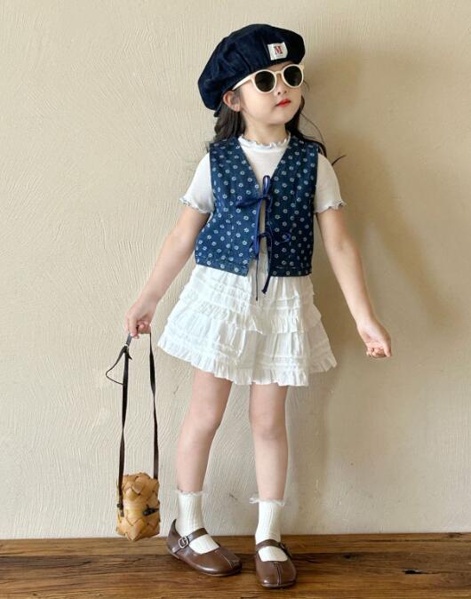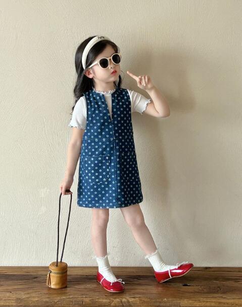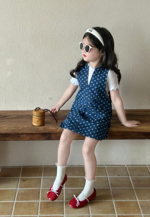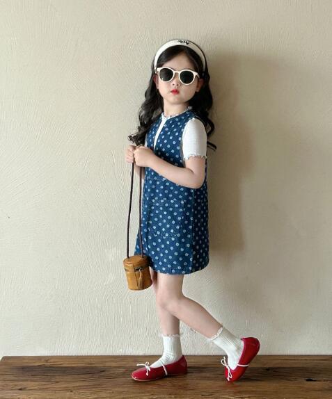 キッズに人気の水玉柄デニムベストと白シャツの可愛いセットです。