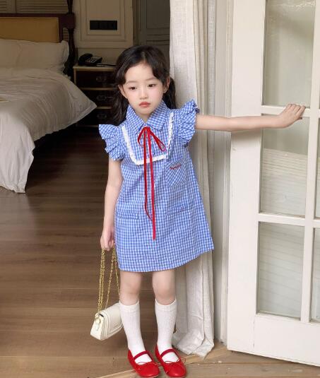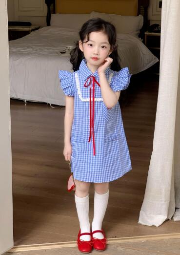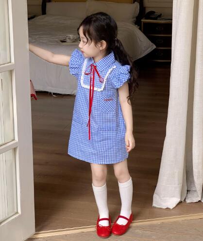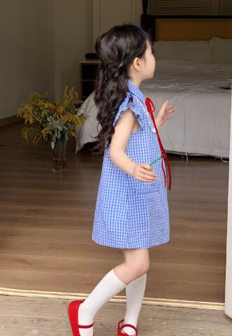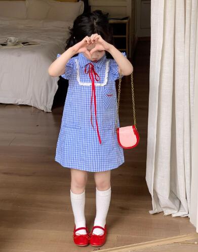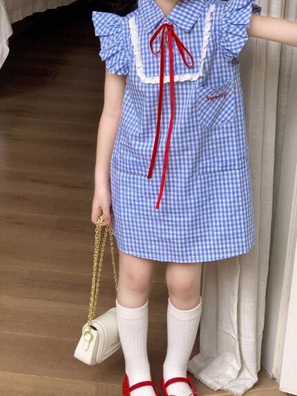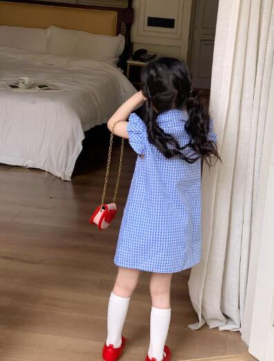 可愛らしい青色のギンガムチェック柄が魅力的なキッズ用ロングワンピースです。