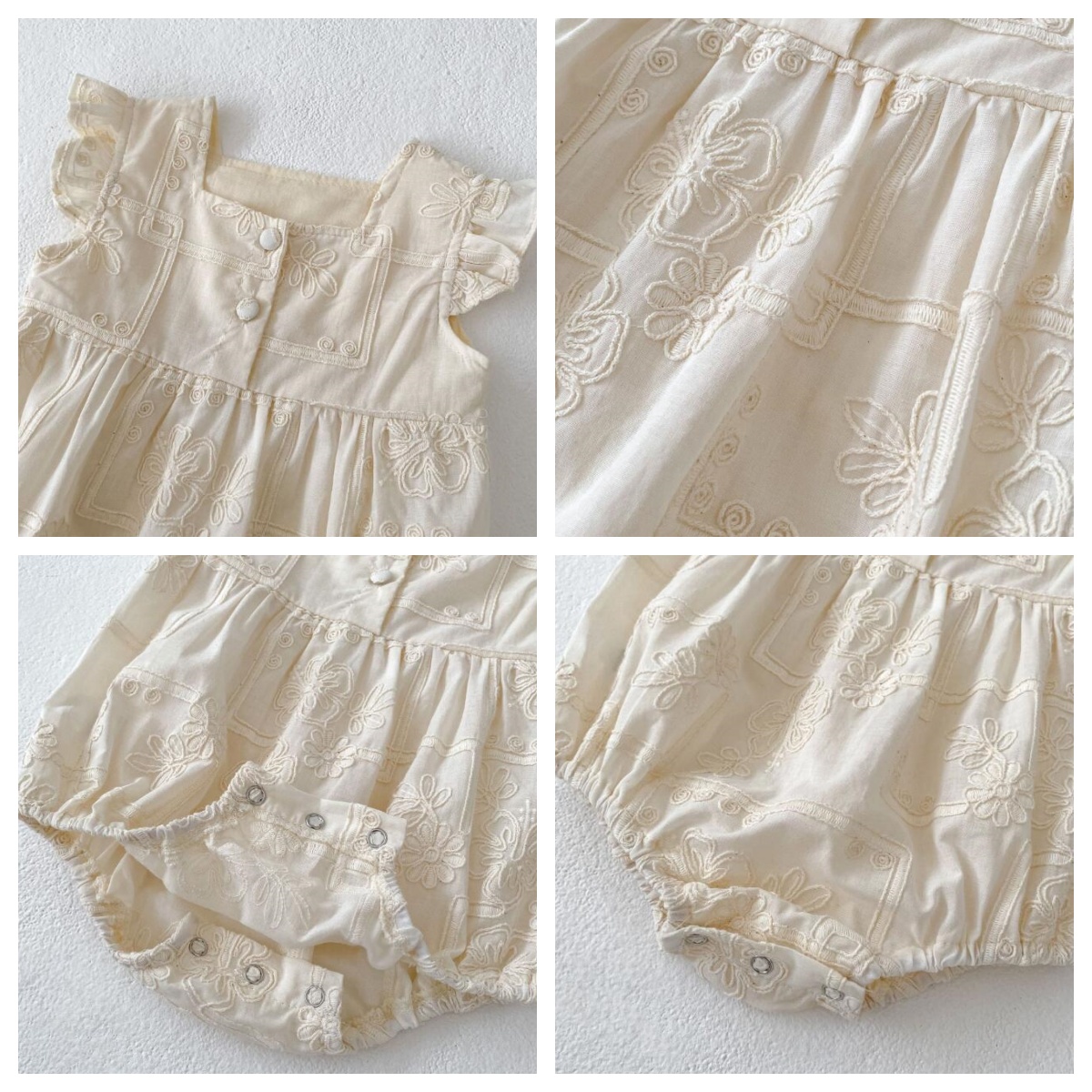 優しいベージュカラーとフリル袖が可愛らしく、特別な日のお出かけにもぴったり。