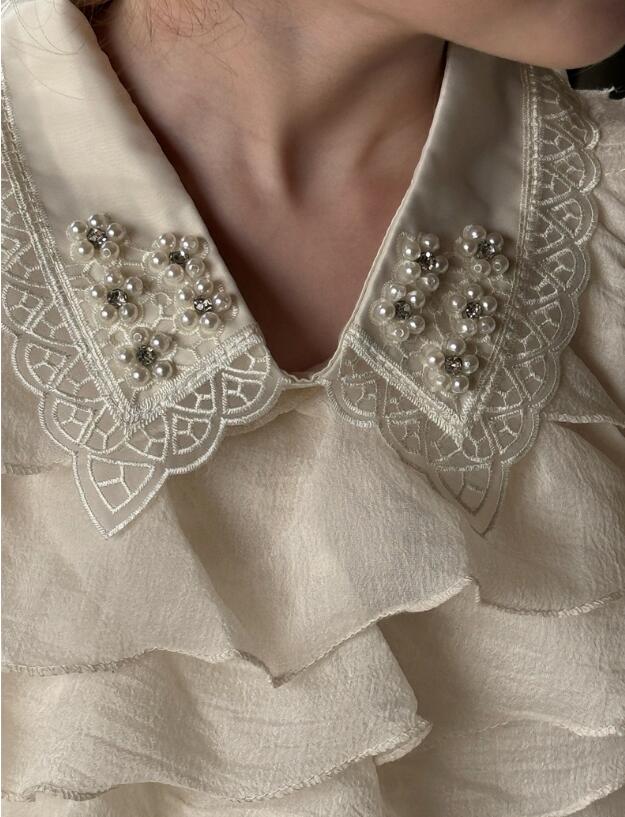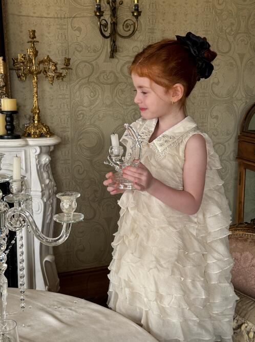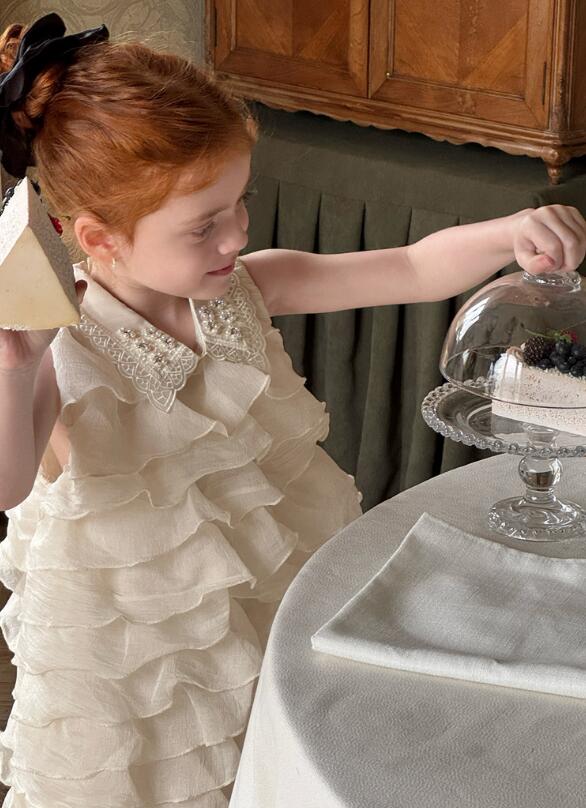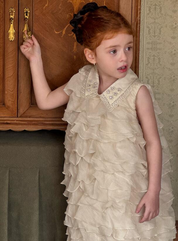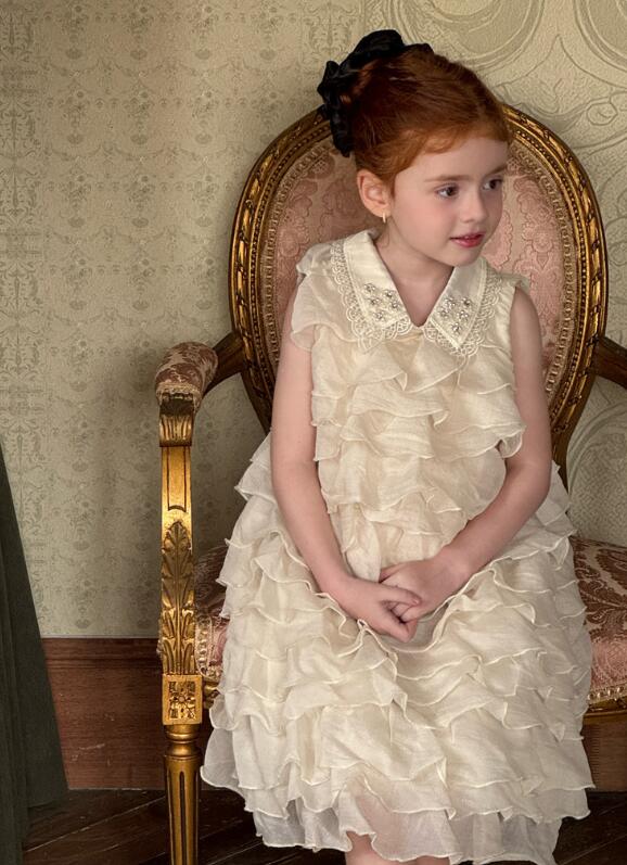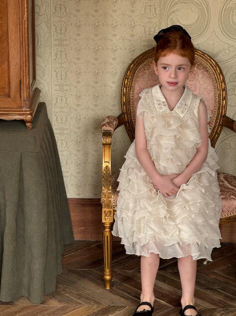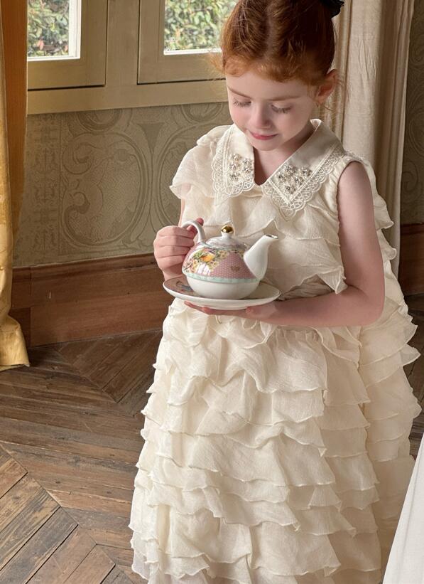 上品なレース襟と美しいフリルが特徴のキッズ用ロングワンピースです。
