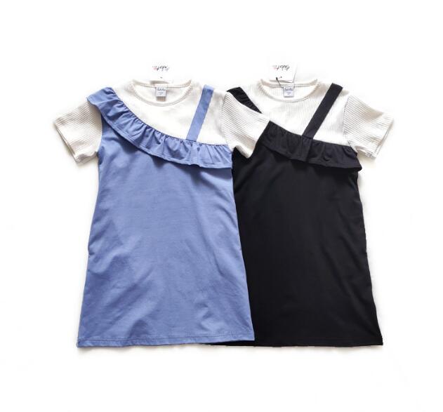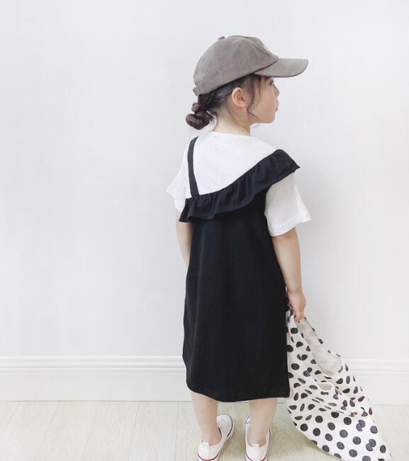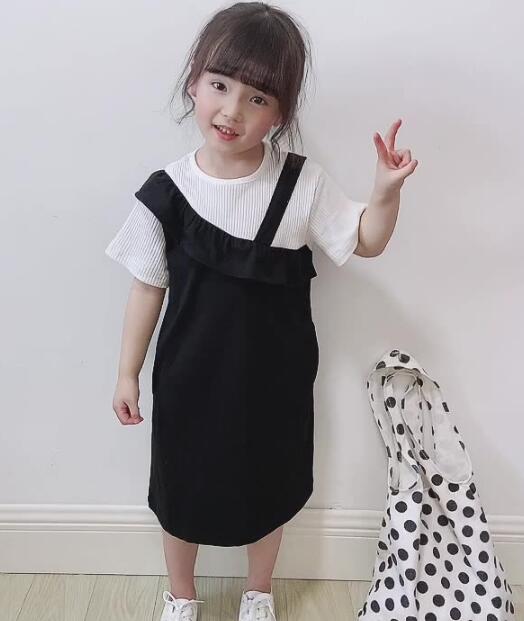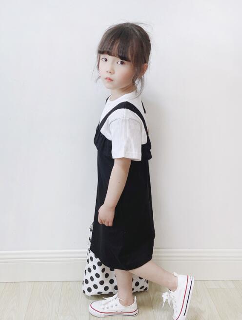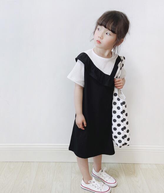 黒のジャンパースカート風デザインで、白のリブトップスとセットで着用できます。
